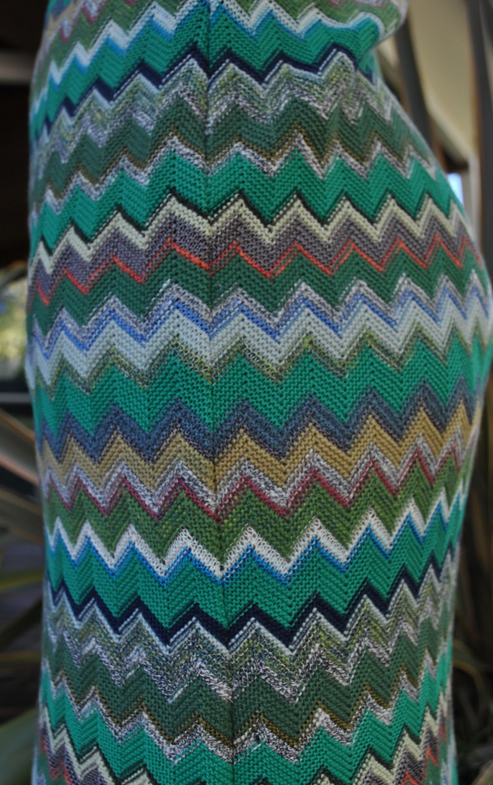 The fabric immediately struck me as very like a Missoni style of fabric, maybe a diffusion line?  I wish I knew for sure…  The fabric has the signature Missoni design; those distinctive stacked zigzags in a multitude of colours (although having said that I do actually possess a genuine Missoni scarf, seen here, that has hardly any zigzag).   Close inspection of my sample revealed seemingly every shade of green under the sun.  Das is gut.  Green is definitely me.  Adding interest to the colour mix; a bit of rust, a dash of salt-and-pepper, a hint of sky blue, the odd startle of vivid orange and even a few rows of ivory; all melding together in a disparate and yet pleasing cacophony of oily swampy shades…