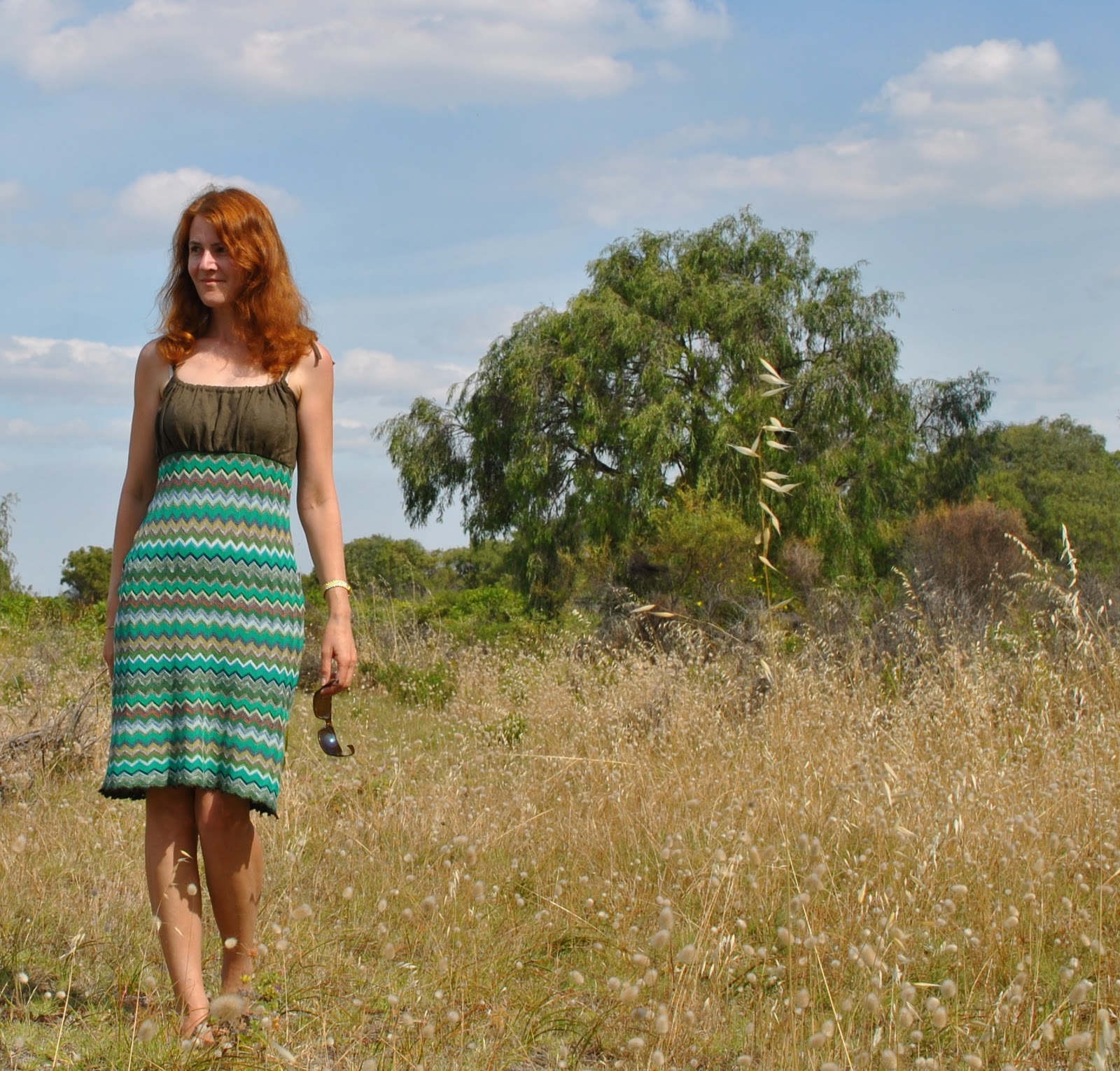 Missoni is a stalwart of the Italian fashion scene and so I wanted make it up into something Italian inspired, and dreamed up this design with a blouse-y linen bodice reminiscent to me of those loosely gathered Italian peasant tops…  I only had the teensiest bit of the knit fabric really.  Actually, (warning; eco boast following) I used basically the entire piece of fabric… and the bodice is the leftovers from this shirt… so the dress is green in more ways than the obvious, hehe…