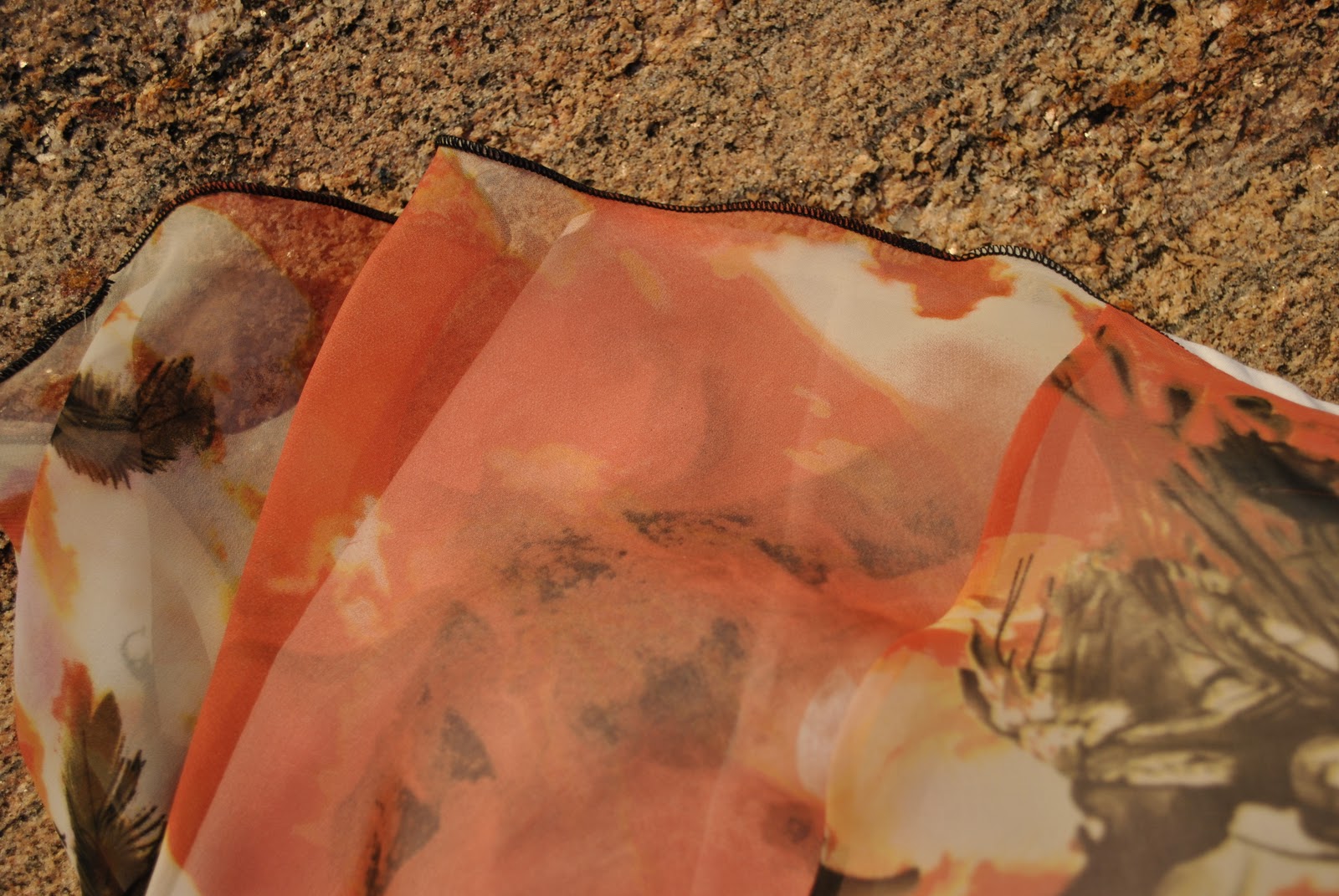 I chose a beautifully coloured and patterned polyester chiffon with a lovely design that is almost post-apocalyptic in its colours and images; fiery swirls of ivory, gold and orange, and with wispy furls of black smoke and black downy feathers floating randomly across.  Surprisingly a cheapie from Spotlight.