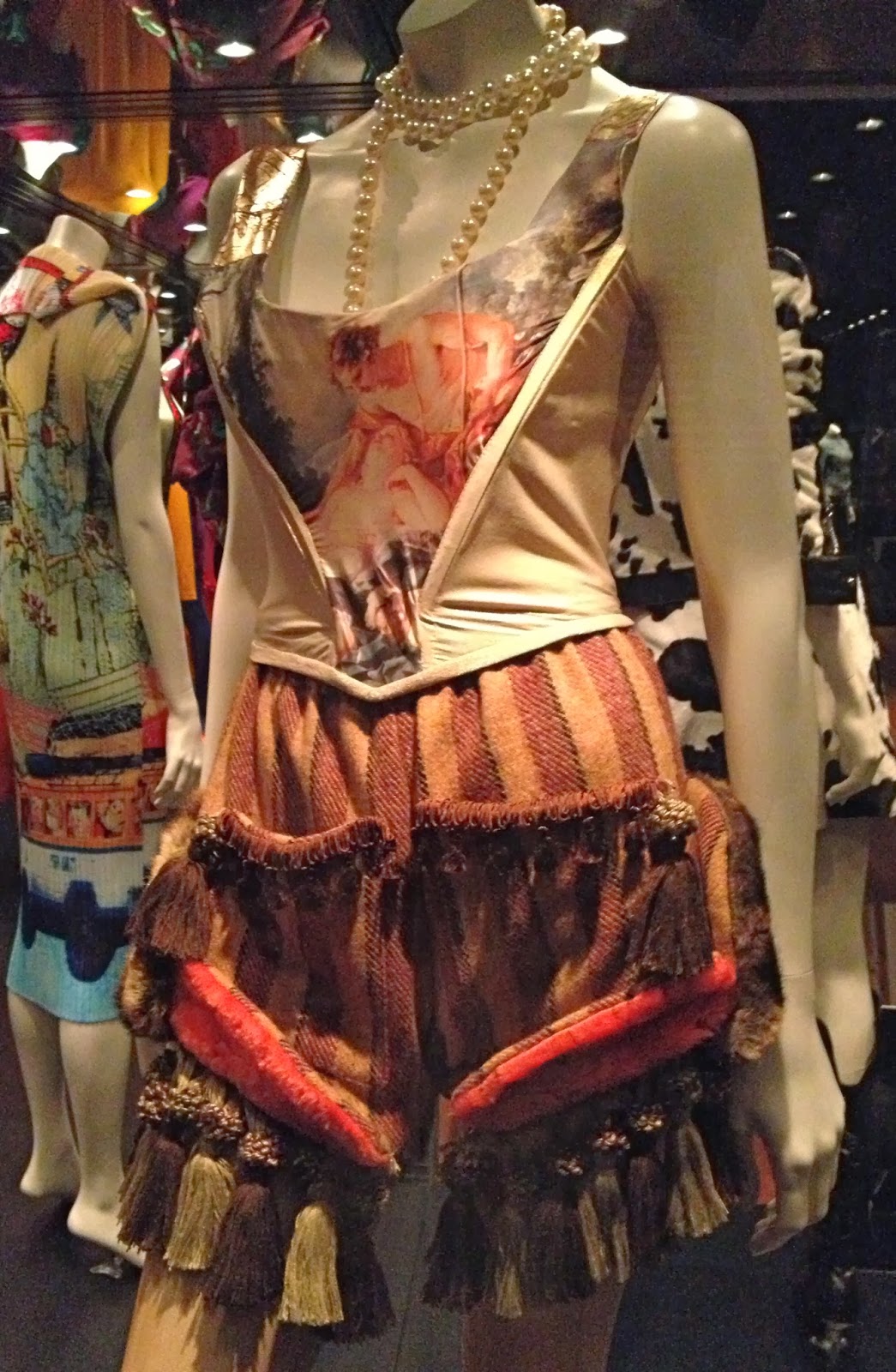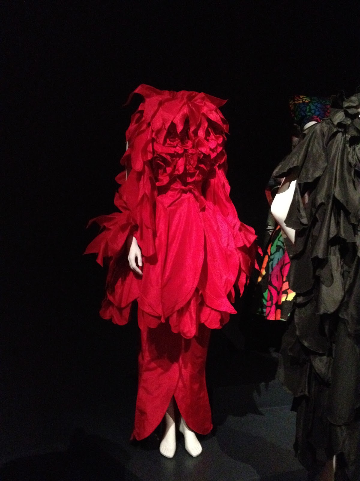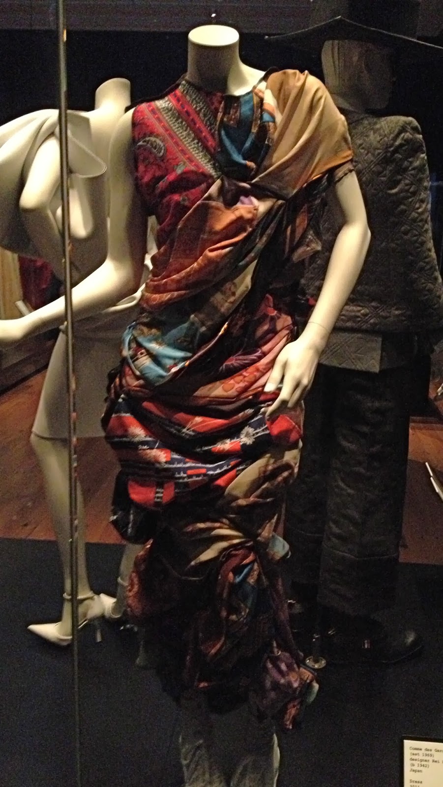 Comme des Garcons, 2011.  terrible photo because it was in the deepest darkest corner of the gallery, but this was Cassie’s favourite piece in the exhibition.  Rei Kawakubo created this intricate bunchy kaleidoscope of a dress using her own silk scarves that she has personally collected over many years.  It is paired with a simple pair of white sand shoes, similar to how it was styled in the runway show.  This is about as feminine and glamorous as it gets in the CdG world.  And absolutely wearable.