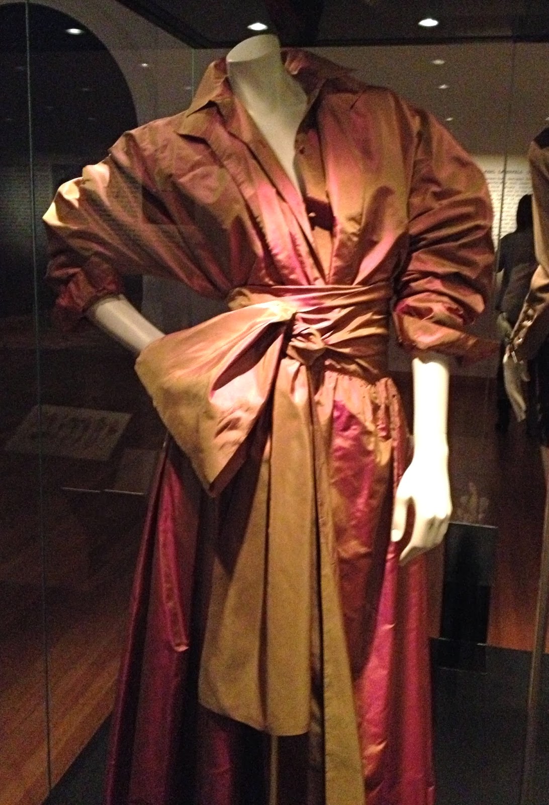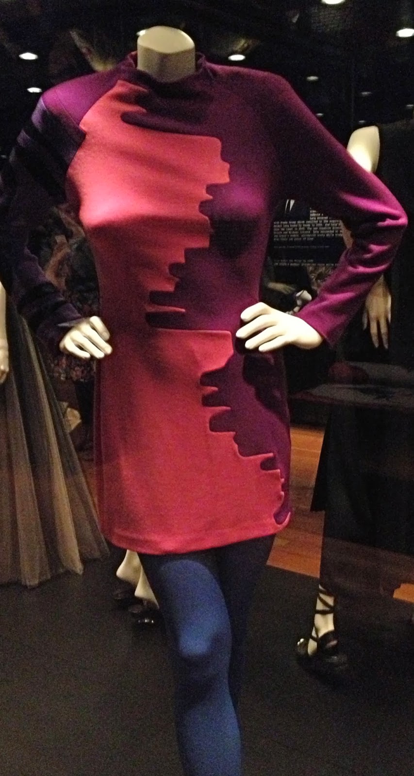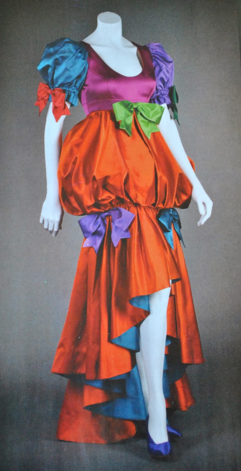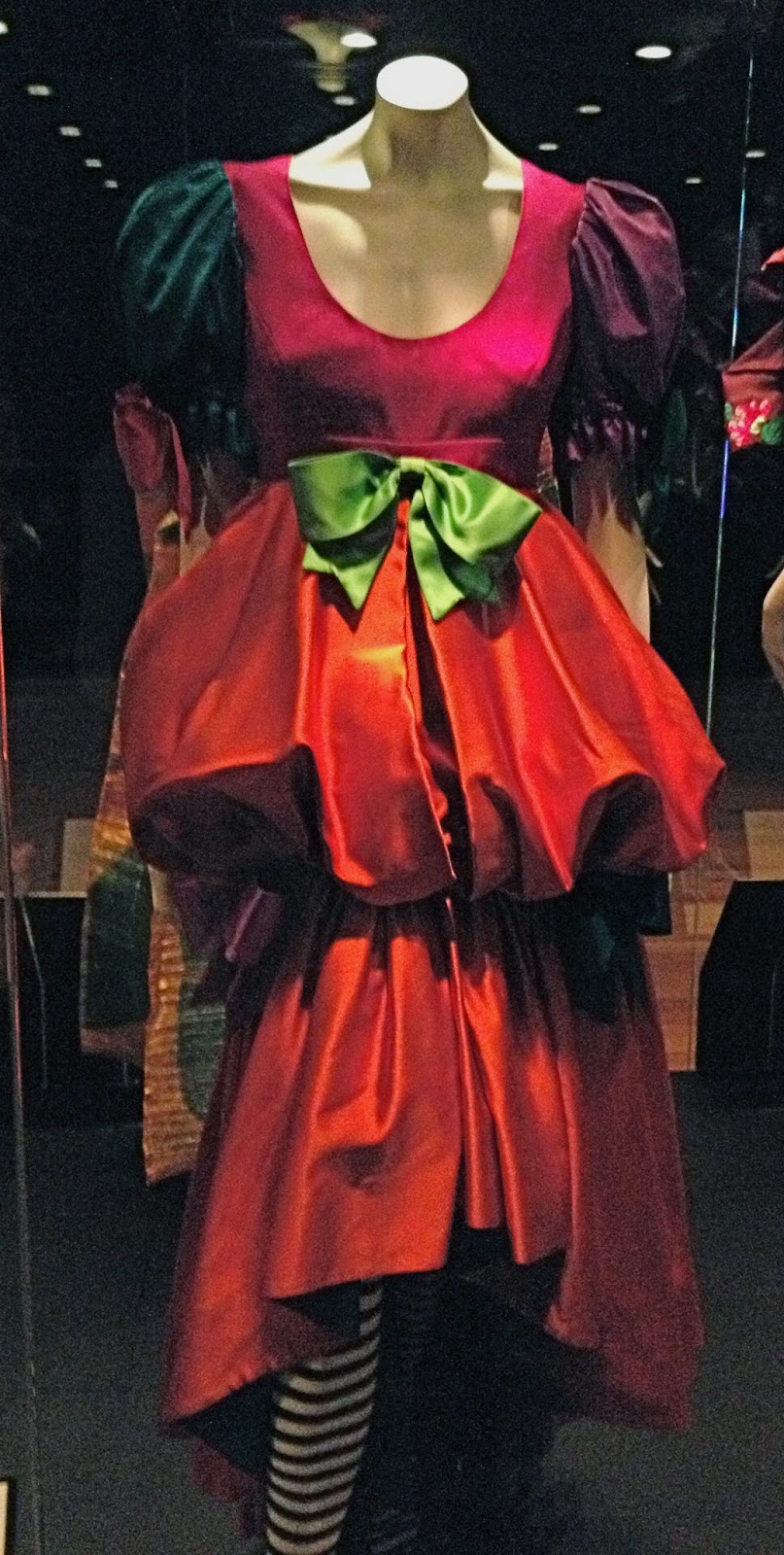 Franco Moschino, 92; I’ve included the picture at left from the Bendigo Advertiser since mine is pretty terrible, but this piece was Mum’s favourite.  We all loved the styling of the exhibit; the black and white striped, wicked-witch-of-the-east tights looked playful and edgy against the frou-frou puffs and bows of jewel-toned satin.