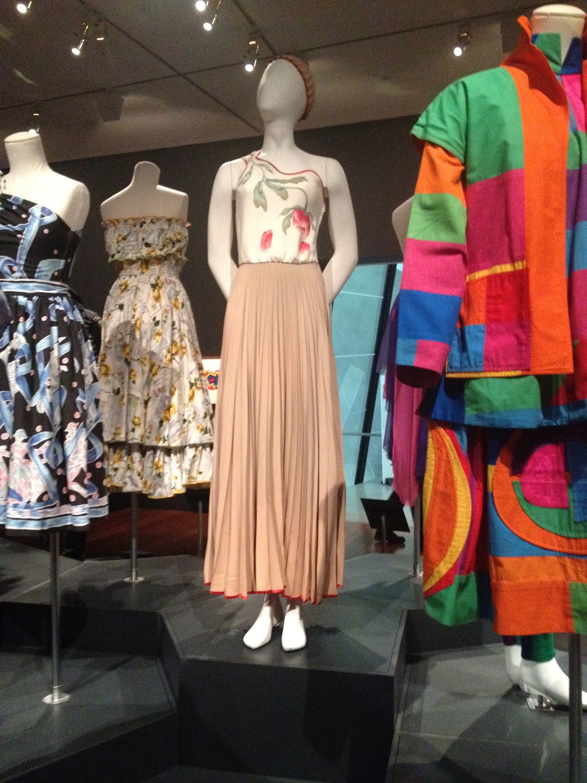 These three dresses at the left are quite a different aesthetic to her usual bold and vivid style, featuring softer muted colours and more conventional design lines.  I probably would not have picked them as Linda Jackson’s if I hadn’t seen them here with my own eyes!