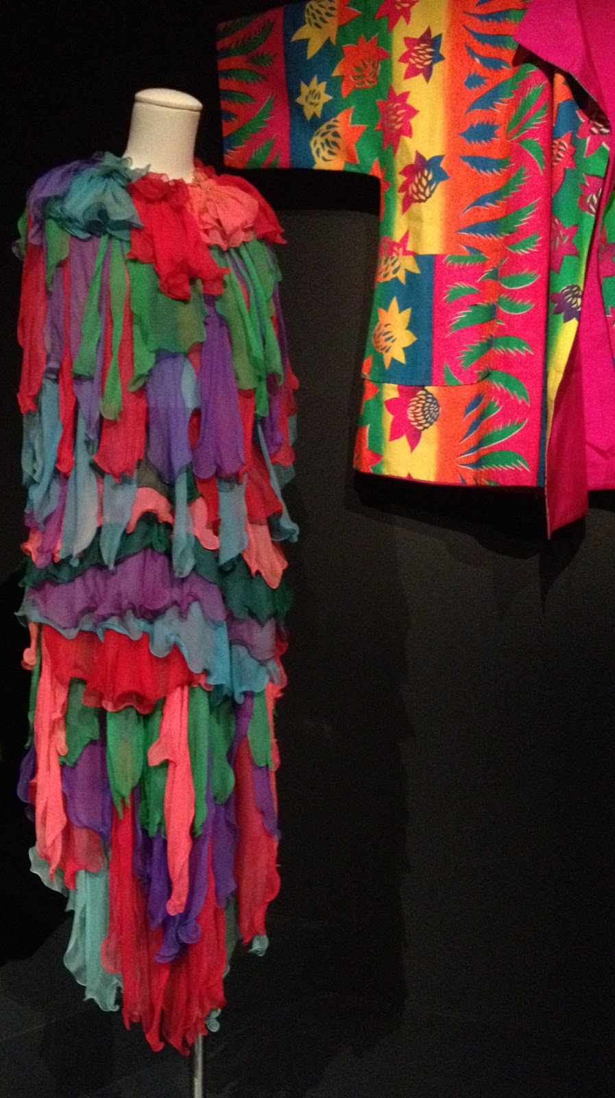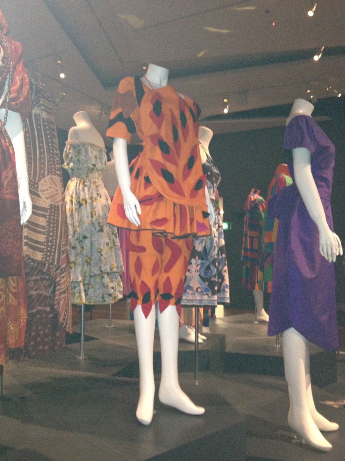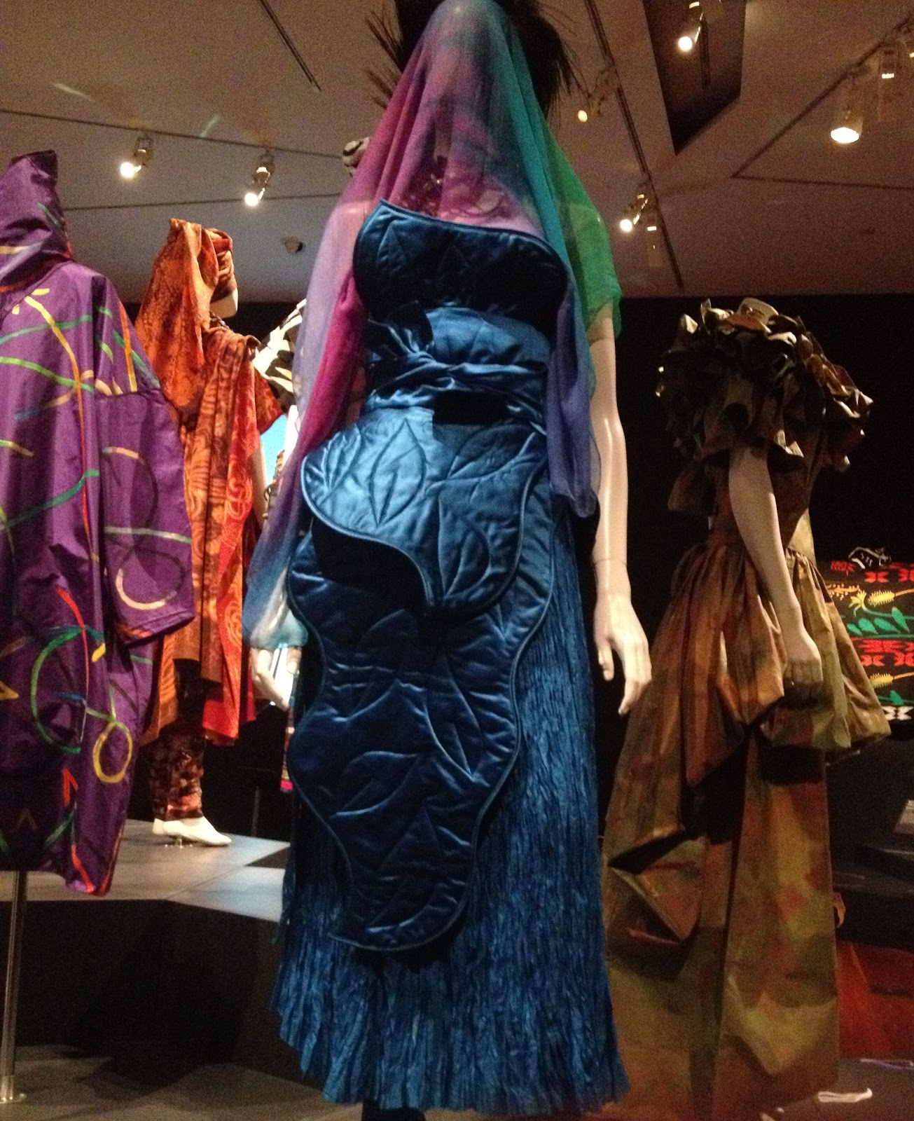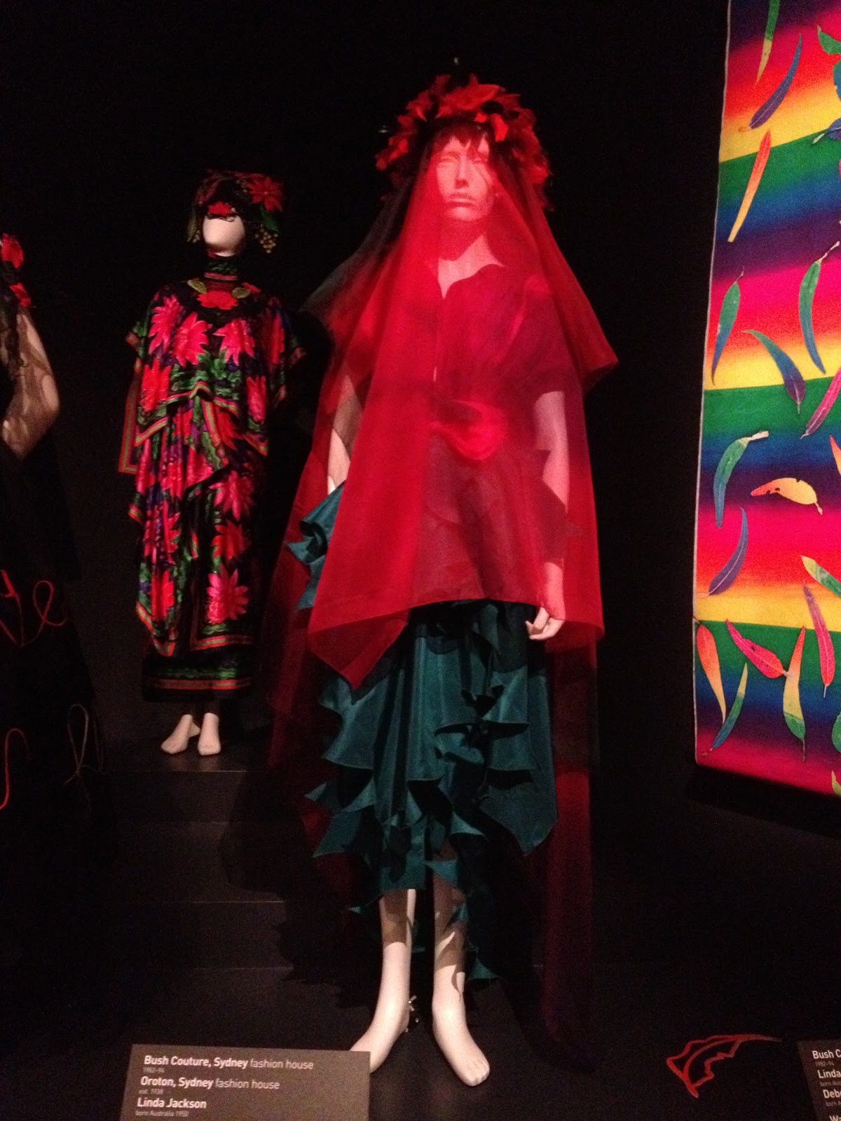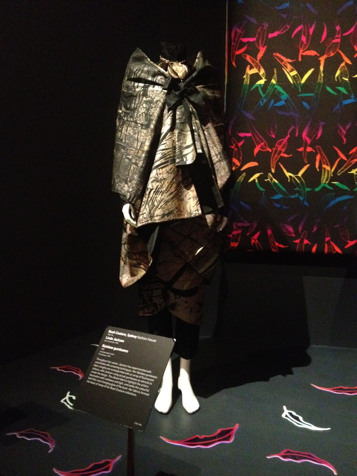 I was idly sorting out my phone the other day, and came across some pictures I snapped at the Linda Jackson Bush Couture exhibition, held in the National Gallery of Victoria.  I visited the gallery last September, and viewed the exhibition then.  These pieces are designed and created by the Australian artist and designer Linda Jackson, most of the examples made in the 1970’s-1980’s.