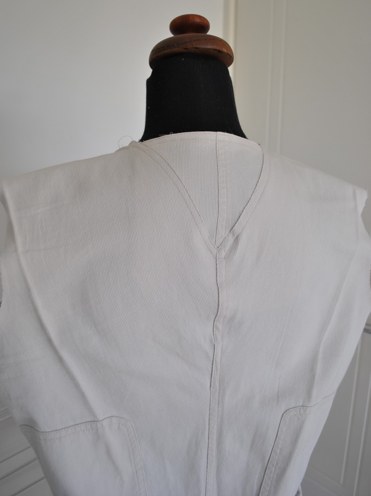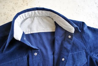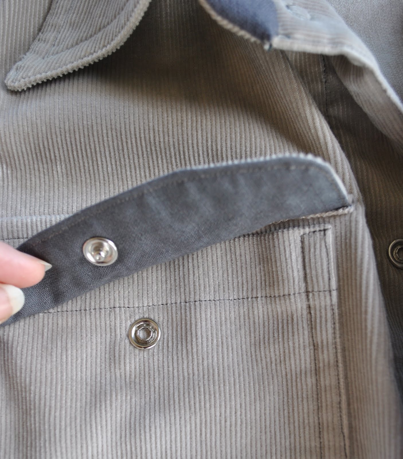I added a tab at the lower edge, and another tab at the neck edge; both features I mentally noted from the army jackets I saw in Tokyo. These both have snap closure.