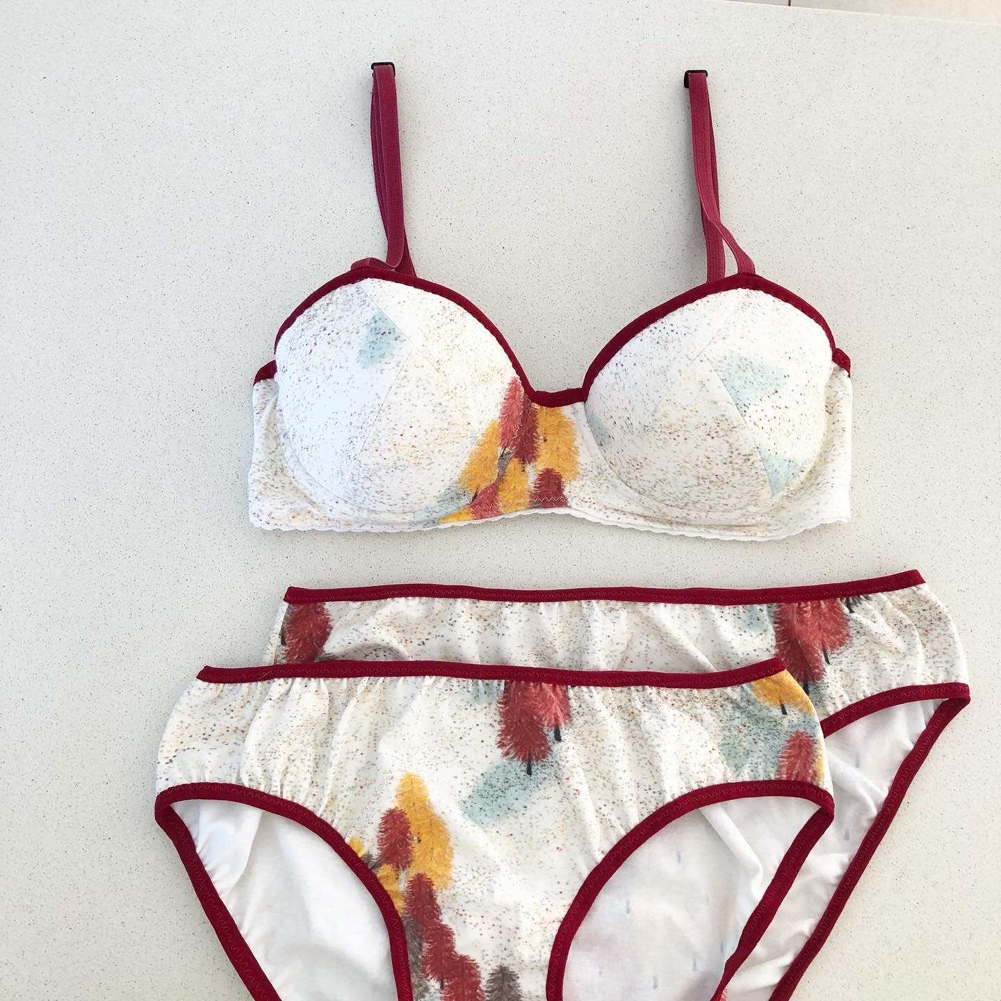 Hello! I’ve made a new lingerie set for myself, using the very last remains of this gorgeous autumn tree swirl cotton jersey. It’s pretty special, since it was designed by Cassie; and is actually available in her Spoonflower shop, should…