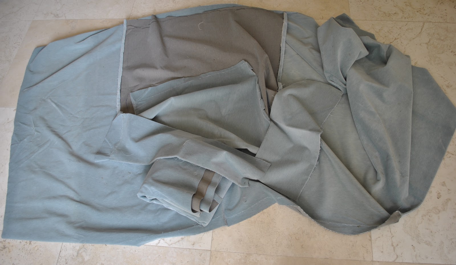 I took a few photos during to illustrate the process, but really it’s not a difficult thing to do, just, well, tiring. Tiring just because of the unwieldiness and bulkiness of it all… Struggling around with large swathes of upholstery weight fabric and draping and pinning, removing to carry over to the sewing machine, sewing, over to the overlocker, overlocking, carrying back to the lounge, re-fitting etc, is just a fairly draining exercise, full stop.