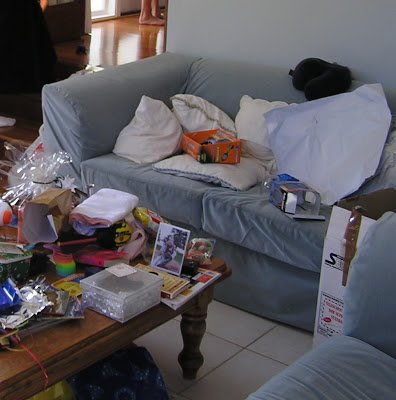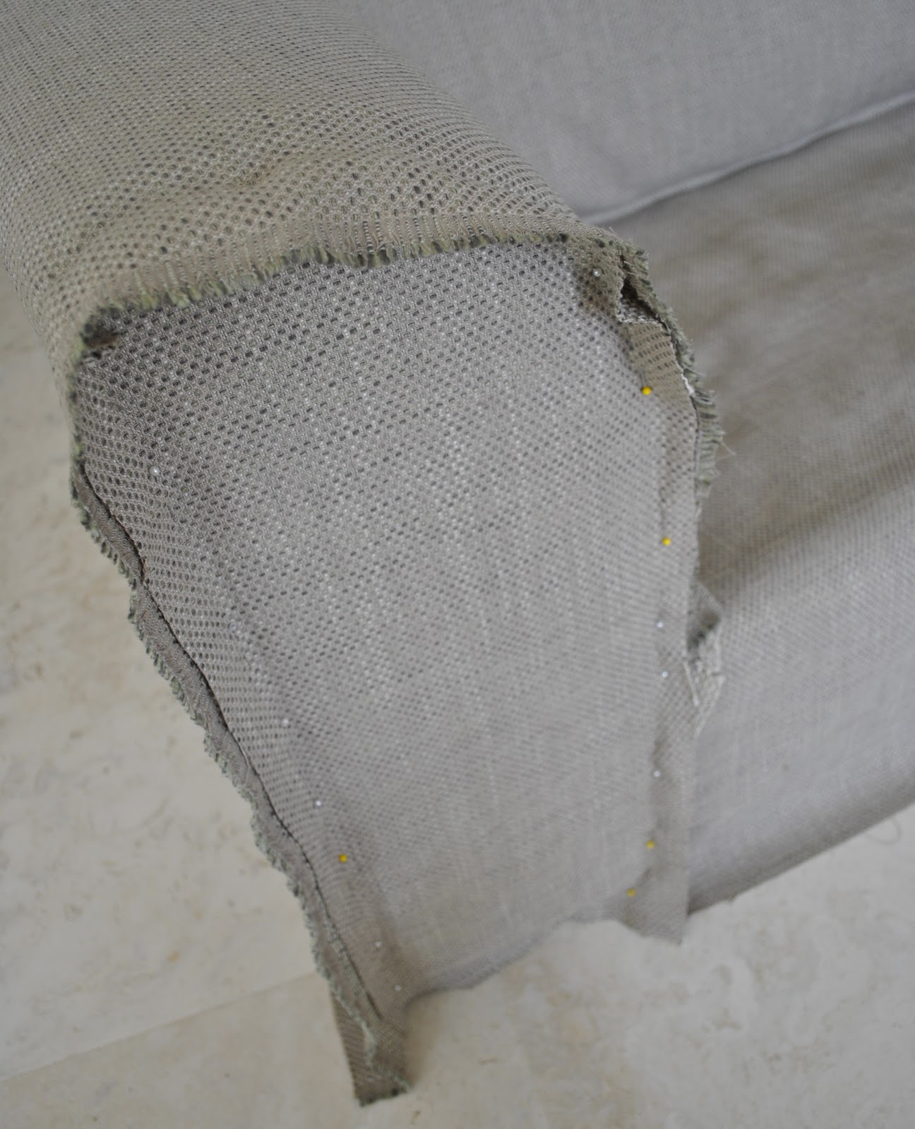 Each cover and cushion cover was pinned and fitted together and basically finished inside out, and only turned right side out when it was ready for final fitting in place. Craig took off the old covers, and fixed a broken strap in the innards of one of the couches, which we only discovered was broken when we took the covers off! He also stapled the edges of the finished and fitted-into-place covers underneath to the wooden frame of the couch, and re-screwed the little wooden “feet” back into place over. Most importantly, he made dinner so I could continue working on the seat cushions undisturbed…. 🙂