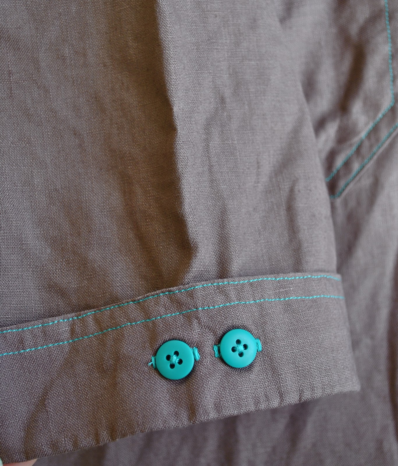To really bring the vivid turquoise visually into the spotlight; I added buttons galore and OD’d on the topstitching, going for double top-stitching throughout, wherever a button or topstitching could be put, there it went!