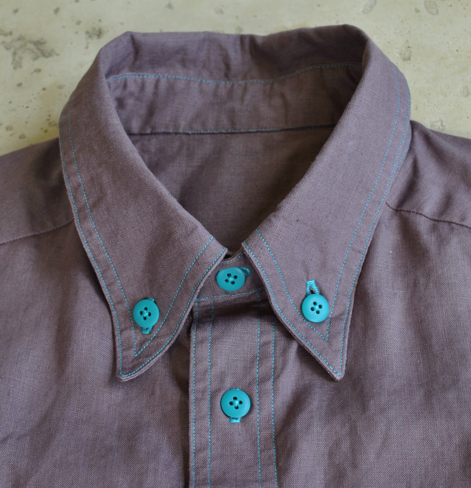 Tim is quite a snappy dresser and cares about his wardrobe, he likes clothes that have that distinctive modern-hipster look; classic lines but with odd details and a slightly grungy edge.  This pattern does have very classic lines, and I thought the unexpected neon jolt of the turquoise buttons and matching thread I used for topstitching throughout adds the edge that the shirt needs to steer it firmly away from boring (from a young man’s point of view) “classic” territory and shimmy it into the “hipster” sphere.