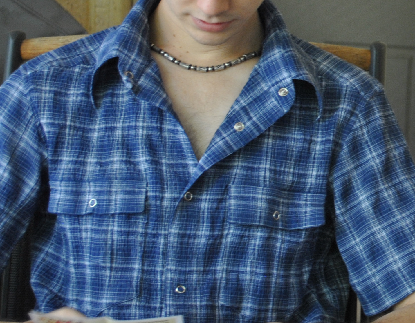 Using Burda 7767 (shock!) with modifications, and he came with me to Fabulous Fabrics himself (genuine shock!) and chose the checked fabric and the wooden buttons to go with it. This fabric is a polycotton, non-stretchy but with a permanent crinkle in it.