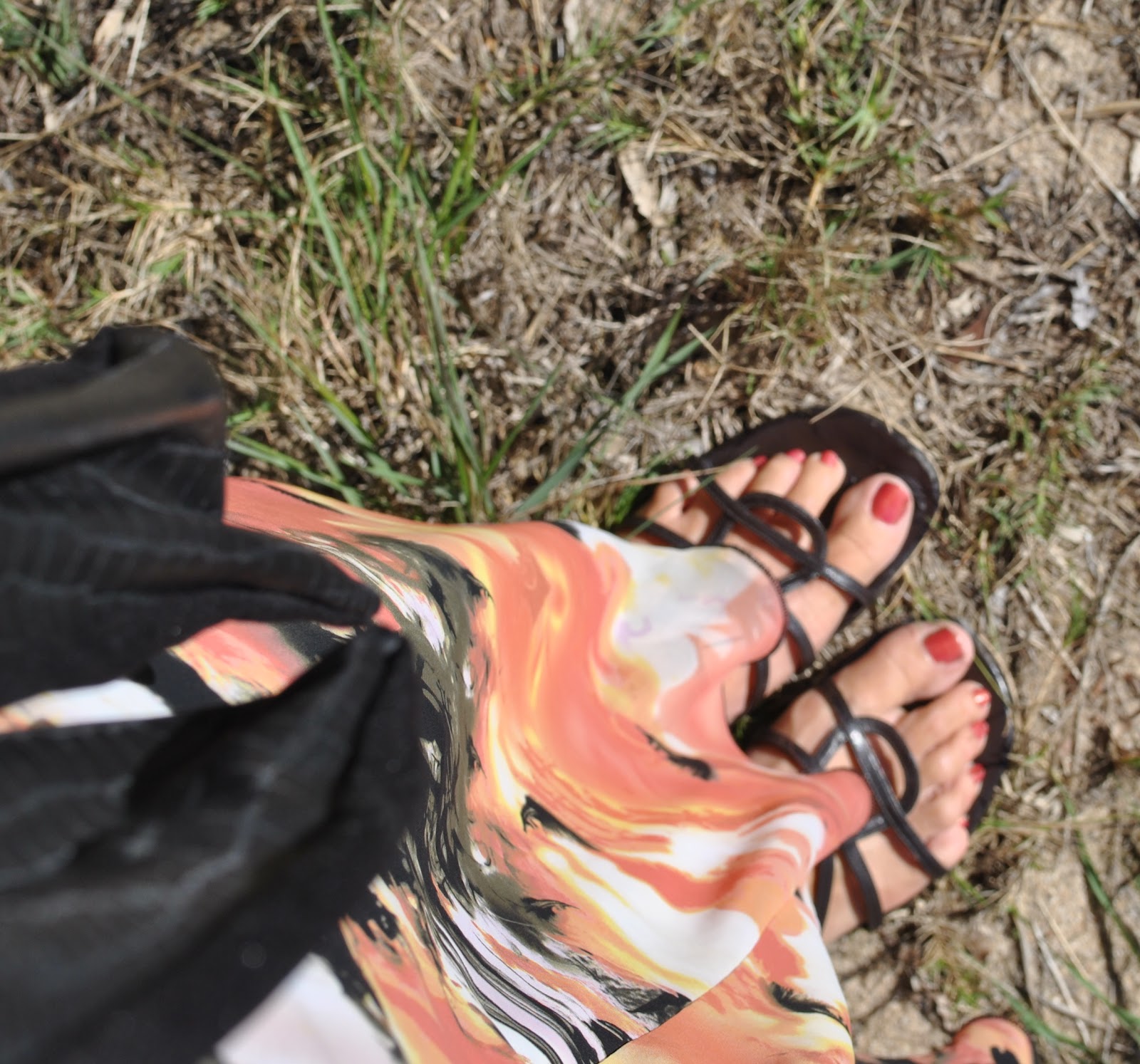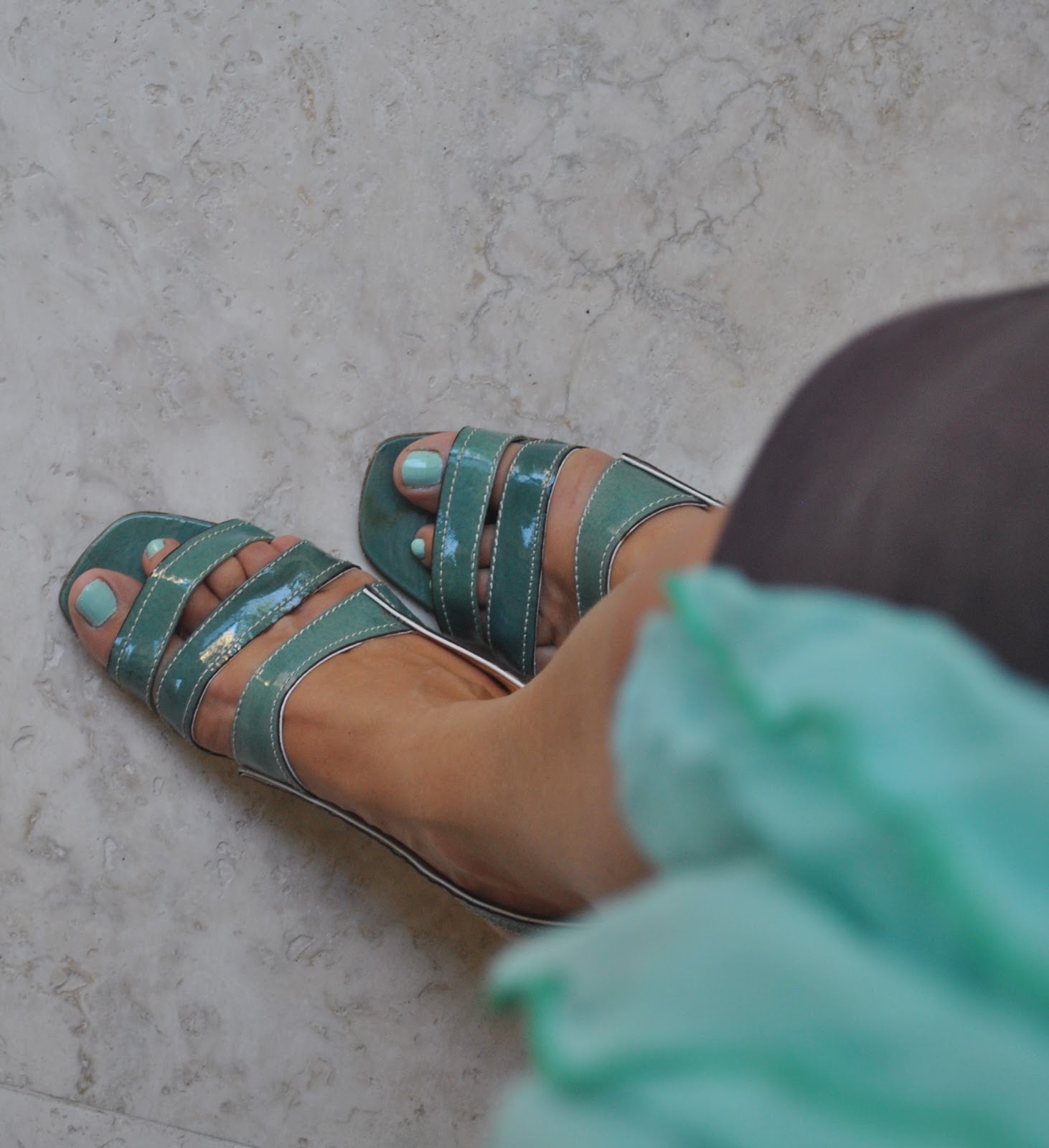 It’s been a while since I wore these sandals and I love the brightness of the turquoise and aqua set off against the sludginess of my eggplant purply brown dress. This photo is re-visiting how I sometimes used to try to take somewhat arty outfit photos; looking down from high at my toes, trying to get all the colours and textures and the gist of the thing in one shot.
