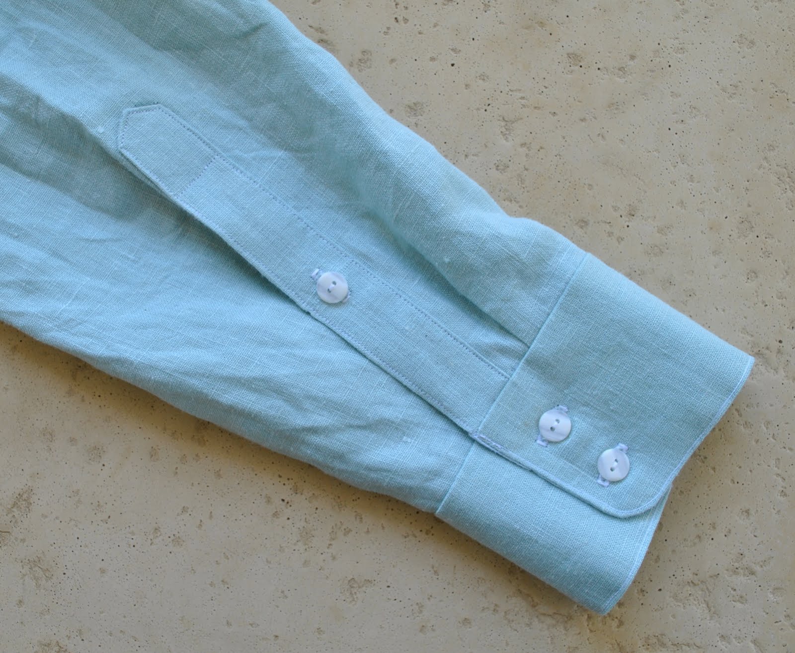 I felt a little guilty about this whole project, because the linen was part of the small stash comprising four lengths of linen that we bought with the very intent of me making shirts out of it for Craig about two years ago… and I did use three of these lengths just for that purpose.  But this rather divinely shaded seafoam-green length sat there and sat there and I couldn’t bring myself to get going on the promised shirt.  It looked so desirable and so right for … well, for me.  I was deviously planning and re-planning about a zillion things NOT of the menswear variety, that I could make using this linen; things would fit very nicely into my wardrobe thank you very much, and I even commenced a bit of a campaign about how this colour was actually a bit feminine, wasn’t it, hmmm? and how Craig now had looooads of linen shirts to choose from and might prefer something else, and how the linen would be reeeeeally much better suited to something else, like say… something for me.  And my sweet husband is so good natured he unselfishly gave up his linen shirt rights just to make me happy…  And I did feel happy for about one minute.  Then I felt mean.  So I set to and made him the promised shirt.  And now I don’t feel mean.  And d’ya know the good news, there is actually a largish chunk of leftovers, maybe enough for something to fit me after all.  And I have a clear conscience.