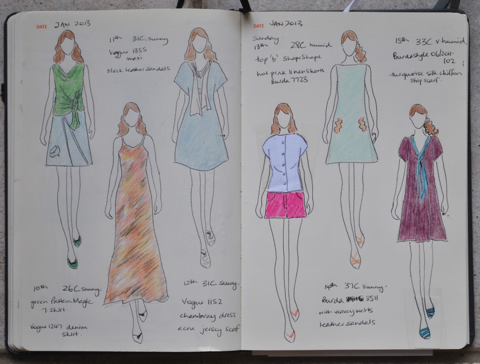 Thank you for the compliments on my drawing, but seriously, y’know I really wasn’t kidding when I said my drawing skills are not all that crash-hot. My paper dolls only look good because of the Fashionary …. you see, the figures on each page are already drawn in for you, naked, in very faint red dots. All you have to do is draw in your clothes. The line drawings on pattern envelopes can be quite helpful for that bit. Then you just dot-to-dot draw in the rest. And then colour in. Yeah. Everyone’s opinion of my drawing skills is dropping dramatically, right?
