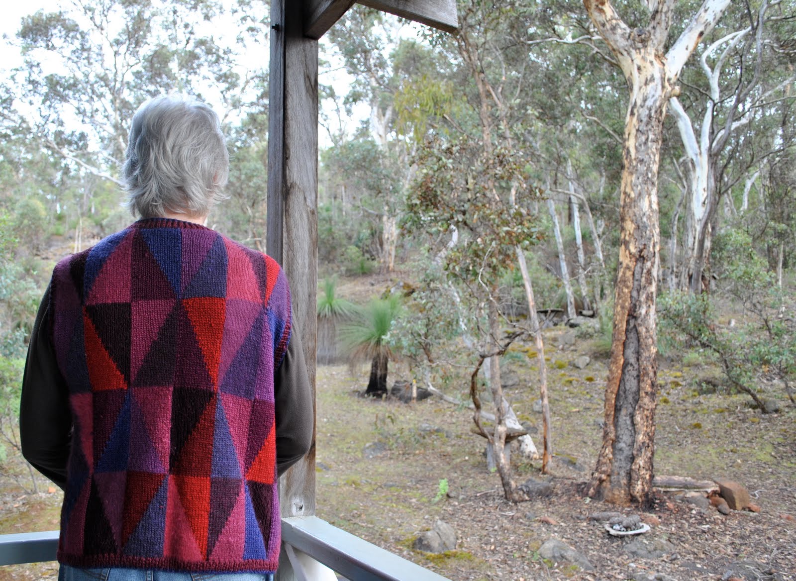 Here is a waistcoat I knitted for my mother, ooh, probably about seventeen or so years ago.  Round about the time Kaffe Fassett was having a big impact on the creative textile world.  I took this photo of her wearing it the last time I went down to stay with Mum and Dad in the country.