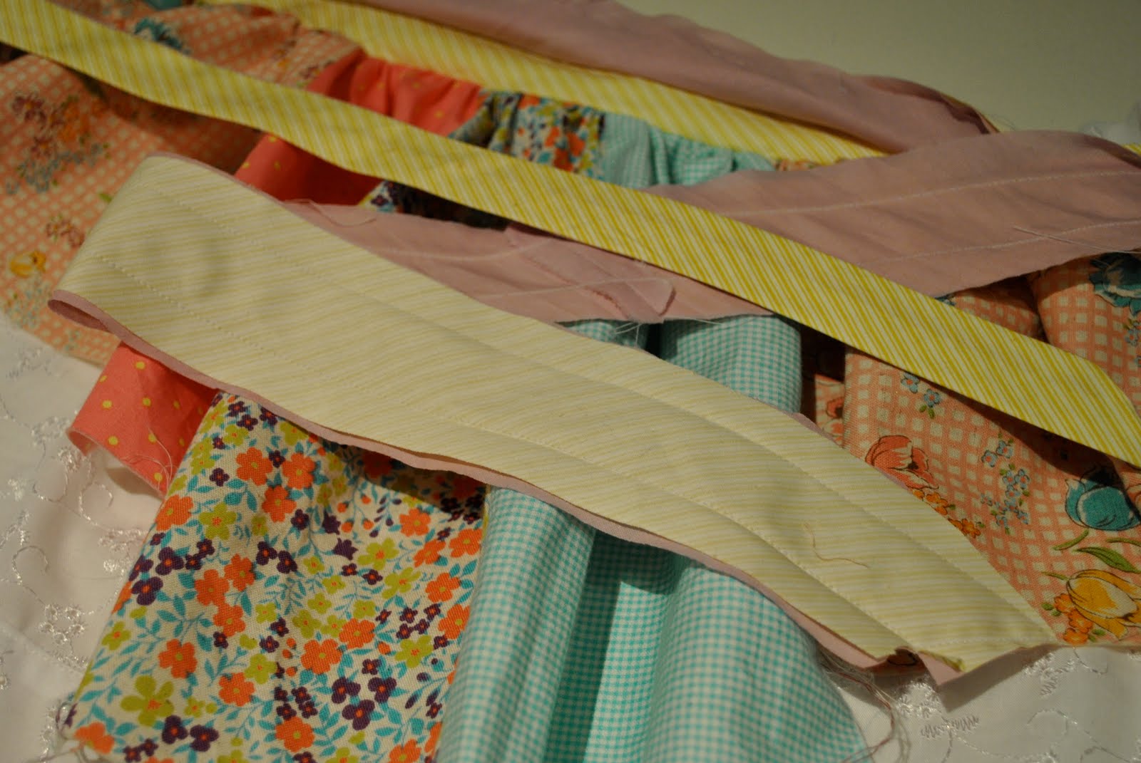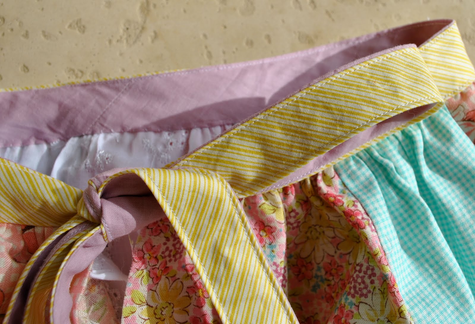 The lilac bias binding was sewn to the lime stripe bias binding, leaving the skirt top open to enable turning right sides out.  Here in this photo  the waistband has been sewn together and one tie end has been turned out and pressed.
