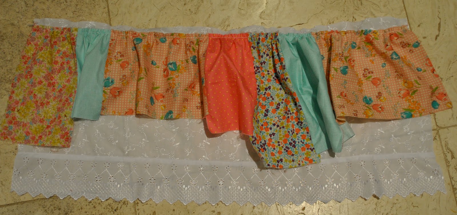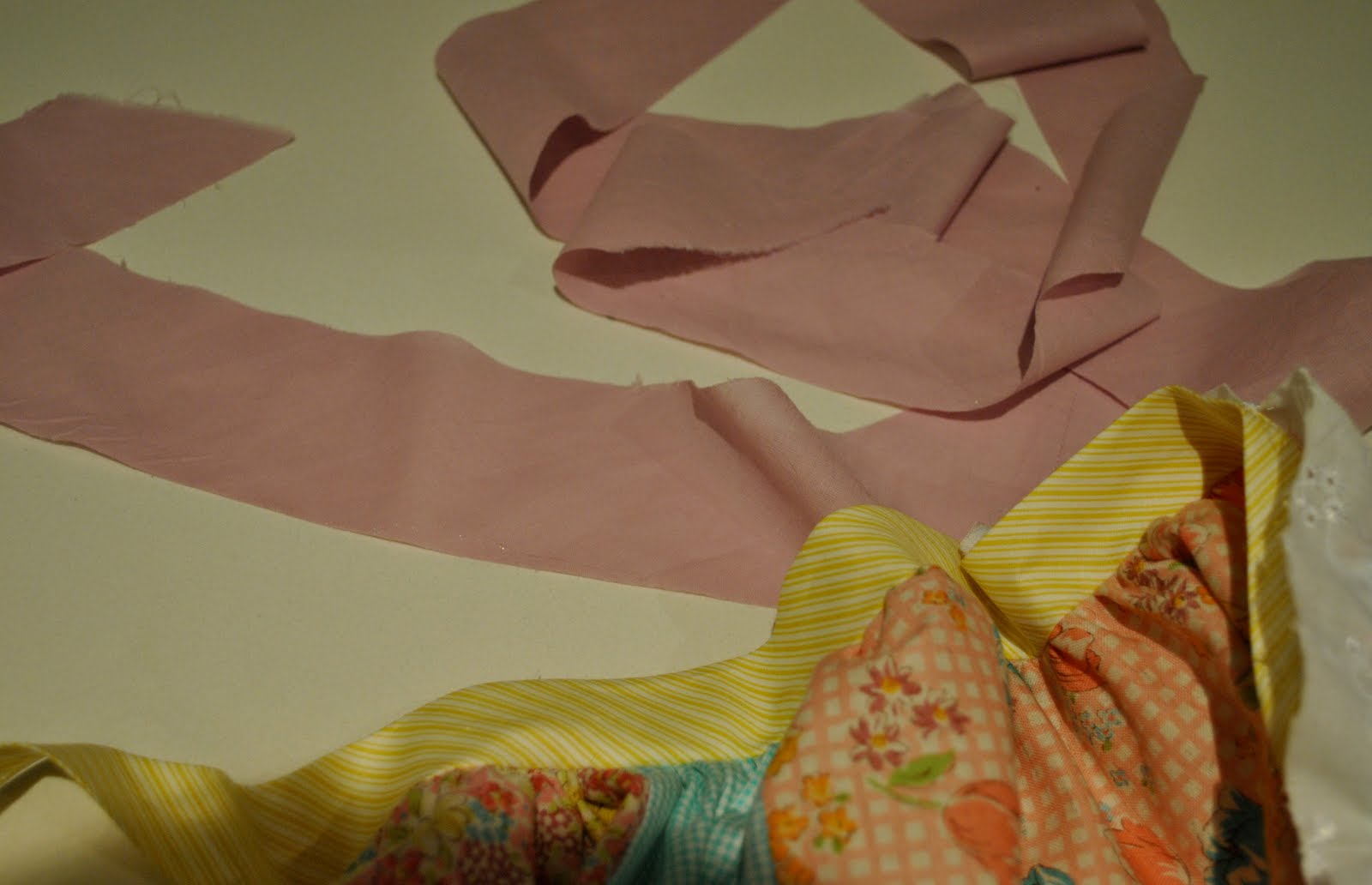Now I’m making a skirt here not a tutu, and obviously the skirt was going to be way too short with just these pieces so what was necessary here? of course a petticoat!  So I bought some broderie anglaise and a little bit of broderie edging and cut to the suitable length; gathered the patched strip to fit on top.  I did it this way because I wanted the overskirt to be gathered in an apron-like fashion over a straighter petticoat…  At this point I had also removed some of the patches, partly  because I realised the strip was going to be too long and partly because I didn’t like some of the fabrics so much.  Then I attached the broderie anglaise edging strip to the bottom edge…
