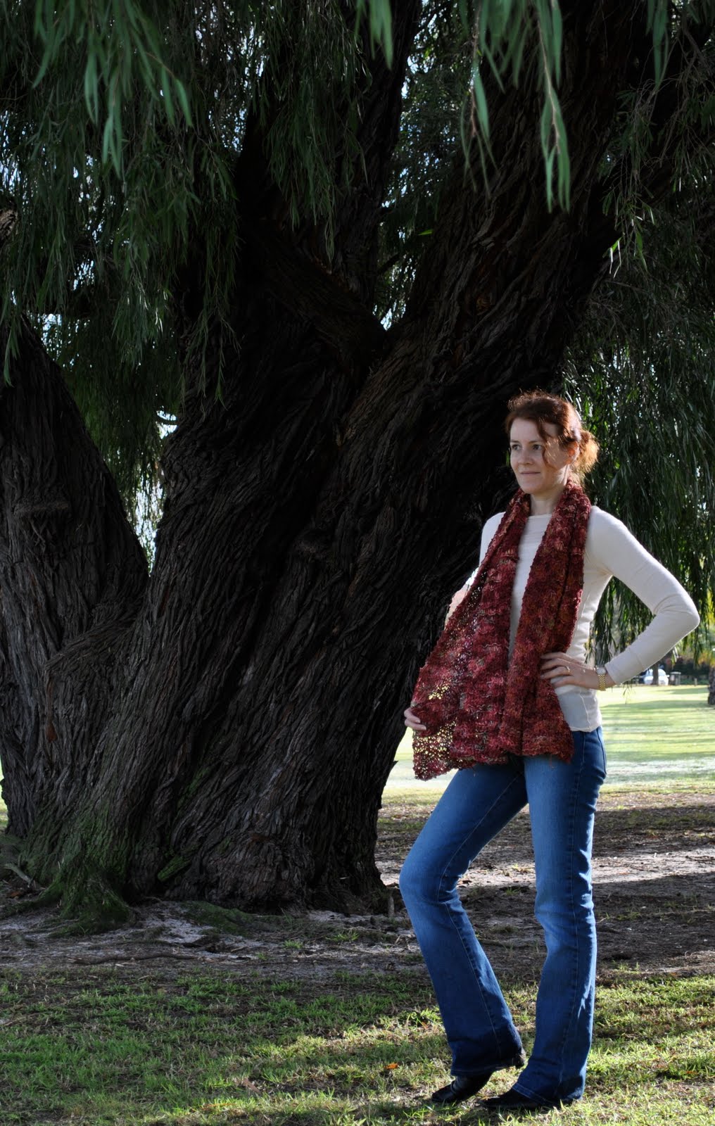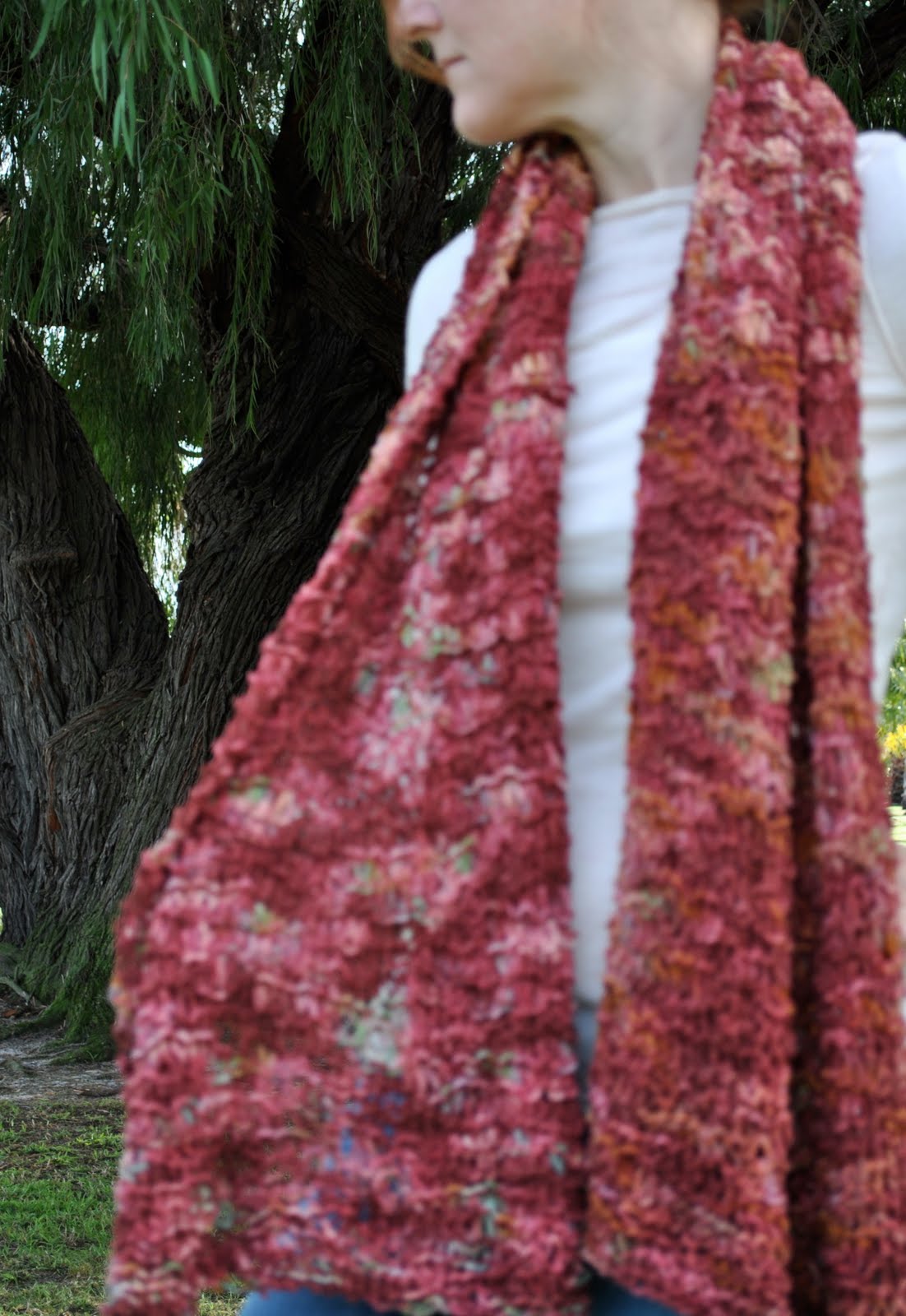 Not to worry, my scrummy scarf is to be talked about here today.  I’ve possibly worn this before on the blog but not mentioned anything about its province, so today it gets a post of its own.  I wish I could remember the name of the Colinette yarn I used; I bought and knitted it up about four years ago and it’s since been discontinued and I can’t find any old tags or any info on the net to enlighten me.  The best I can do is to tell you it’s a chenille in a beautiful array of toasty, spicy, berry-preserves colours guaranteed to start warming you up before you’ve even wrapped it around your neck…