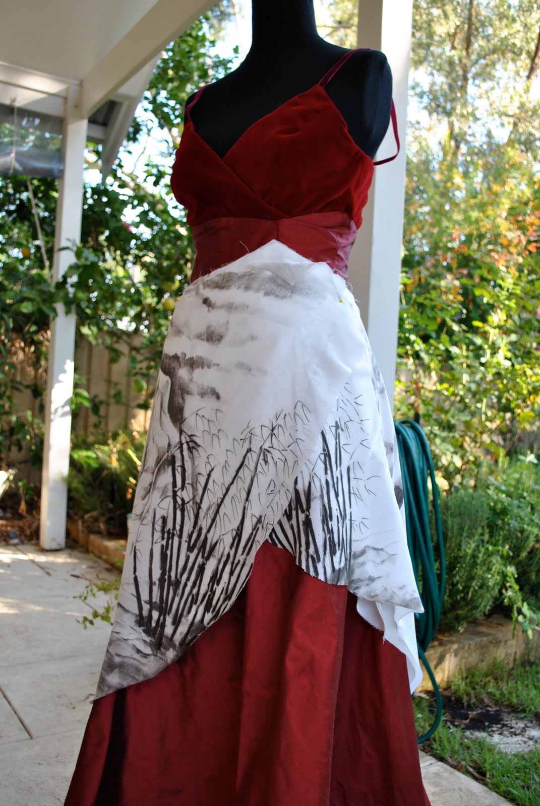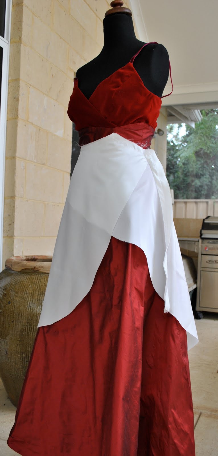 Dress; mostly my own design with some elements of Butterick 4657 and Simplicity 9775, red velvet, red shot silk taffeta and ivory/black printed polyester