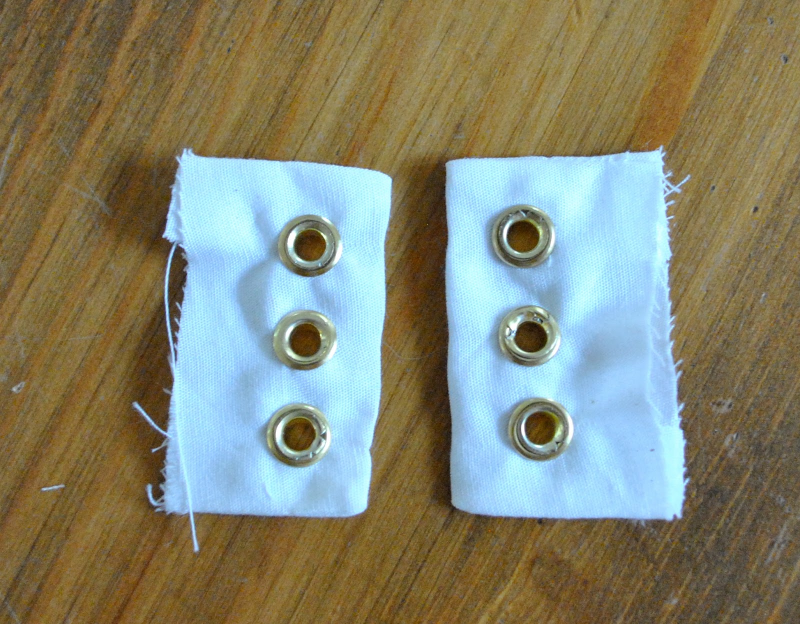 Now for the corset bits. I’m using a leftover scrap of very strong cotton, because eyelets and lacing can be tough on delicate fabrics. I sewed a couple of, er there’s probably a proper name for these little bits… and it’s unknown to me… facings? … flaps?
