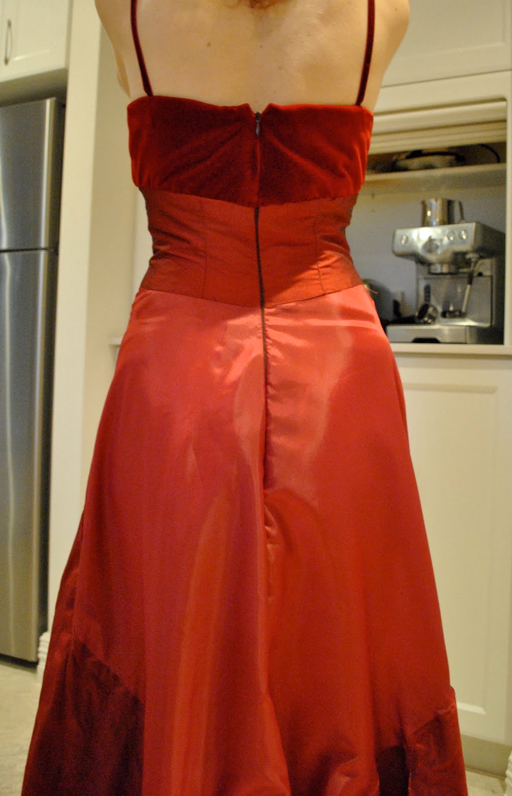 I had just enough to cut out two front pieces and a strip the same length as my neck piece (er, the same length once I pieced together three smaller strips, that is). Sewing these to their corresponding fashion fabric pieces right sides together at the edges, turning right side out, then treating as one piece seemed to do the trick nicely. I apologise that they look a bit cat-hair-y in this photo. I did say the fabric had been sitting around a while…! And you can probably make out the selvedge holes along the edge of the silk jersey, I really did have only just enough fabric! Yeah, I could have bought a bit more fabric, but by now I was on a minimal-wastage mission…