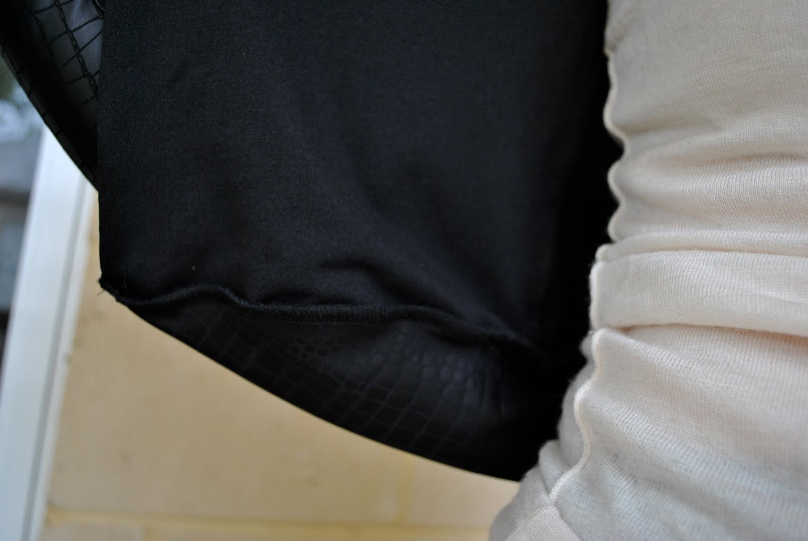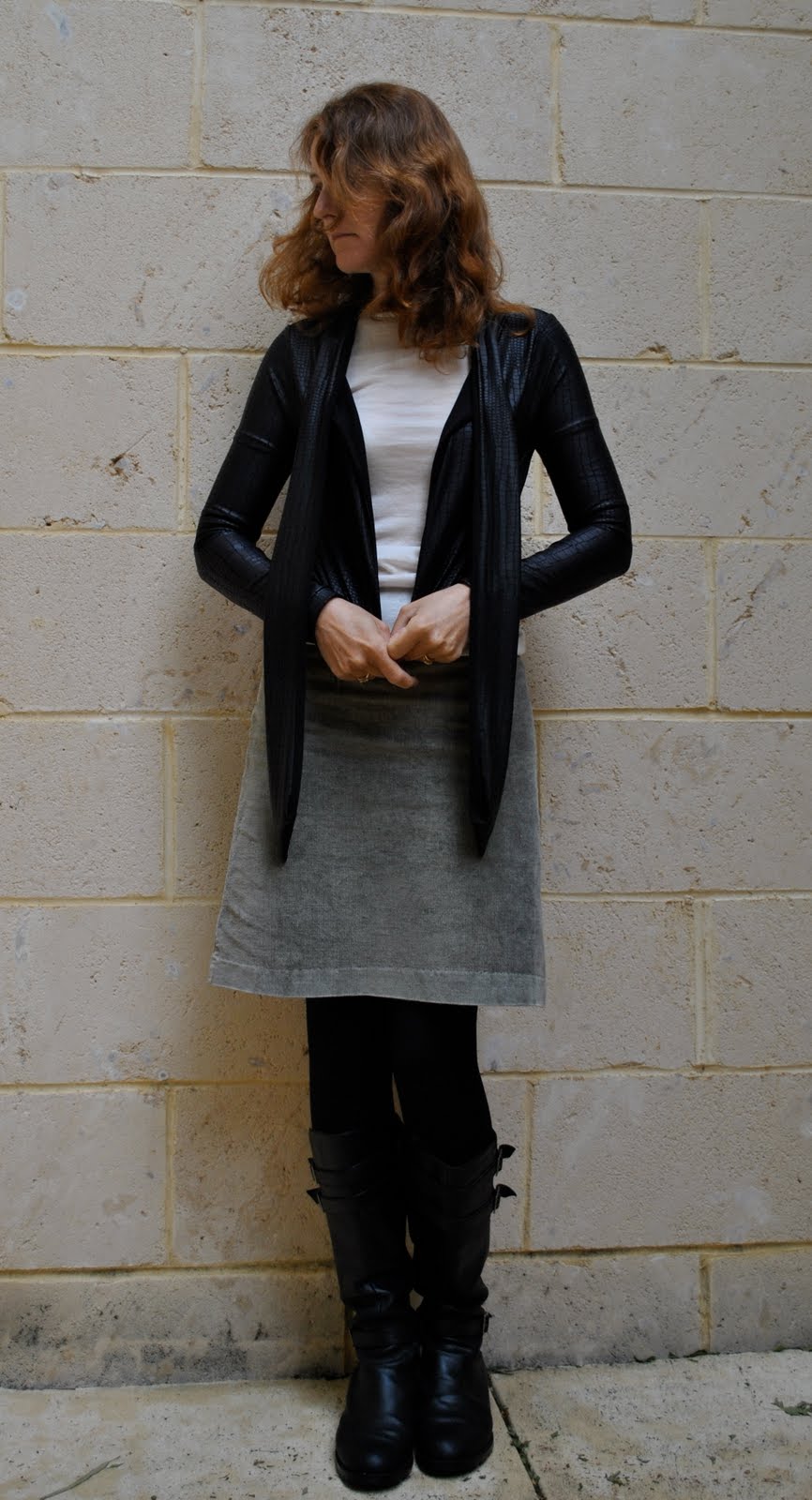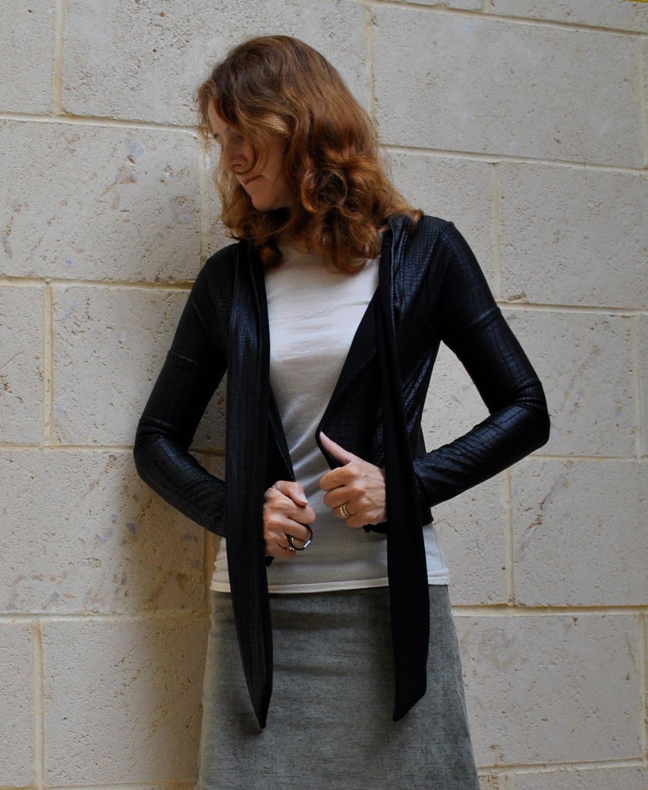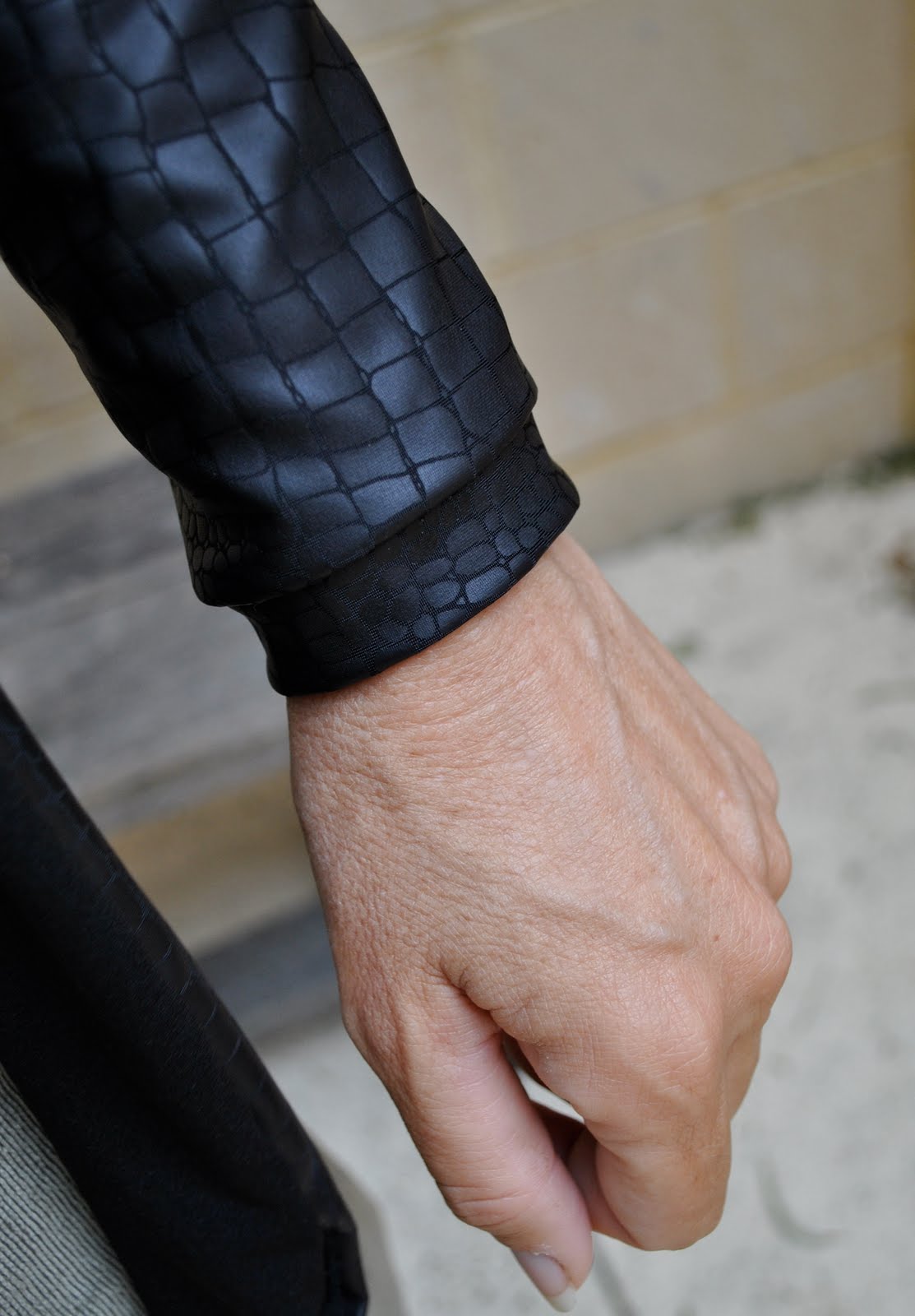 Do you remember me mentioning some rubber/plastic coated jersey knit, stamped in a kind of scaly print that I thought would be ideal to finish off my python print satin outfit, but it wasn’t? (I know, shocking grammar, there has to be a better way of phrasing that…) Gorgeous and unusual fabric, fell in love with it at first sight. A tough-but-still-chic-looking leather alternative to satisfy even the most ardent PETA supporter. I think I’ll be wearing it a lot this autumn/winter!