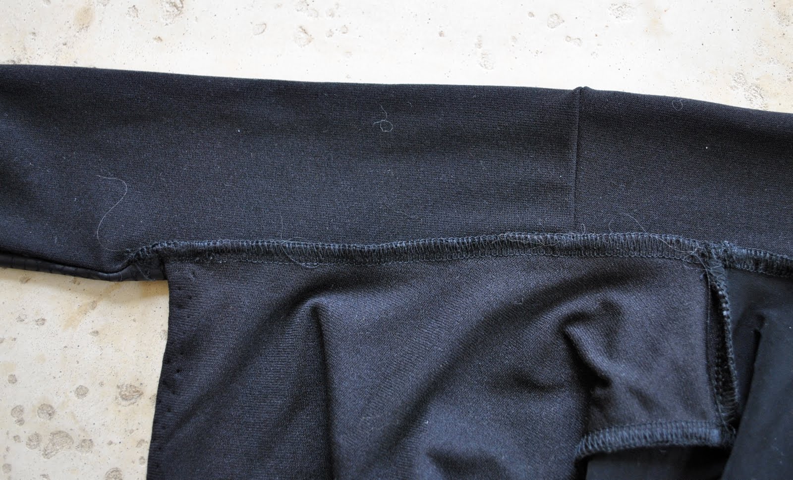 The wrist bands are made by serging your wrist strip along its short edge into a tube. Fold this in half wrong sides together around the circular middle of the tube. Pin to the right side of your sewn-together sleeve and serge around the raw edges.