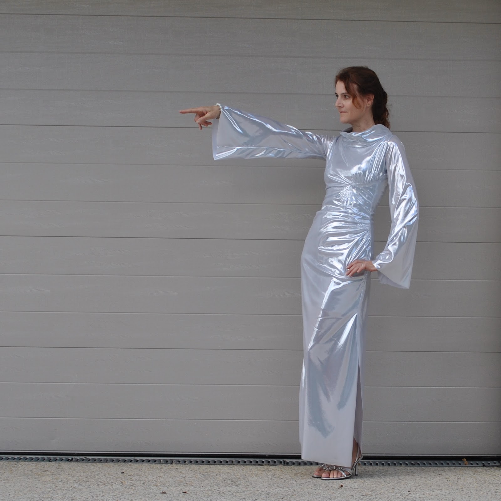 The back is quite plain and featureless, basically a fitted Tshirt dress. Like Servalan’s dress, the skirt has a long slit in one side, for walking ease. Unlike Servalan’s, which has a centre back zip, mine has enough stretch for it to be a pull-over the head affair.