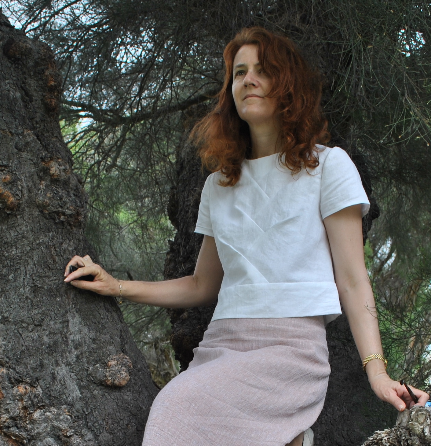 Top; based on the “bamboo shoot” design in Pattern Magic, by Tomoko Nakamichi, finished blouse of my own design, white linen