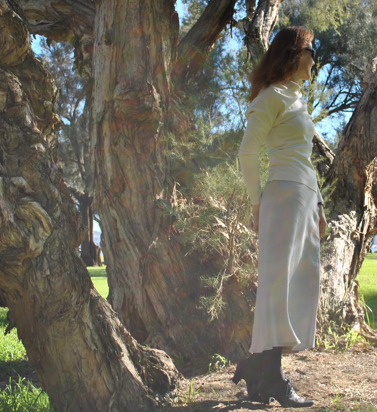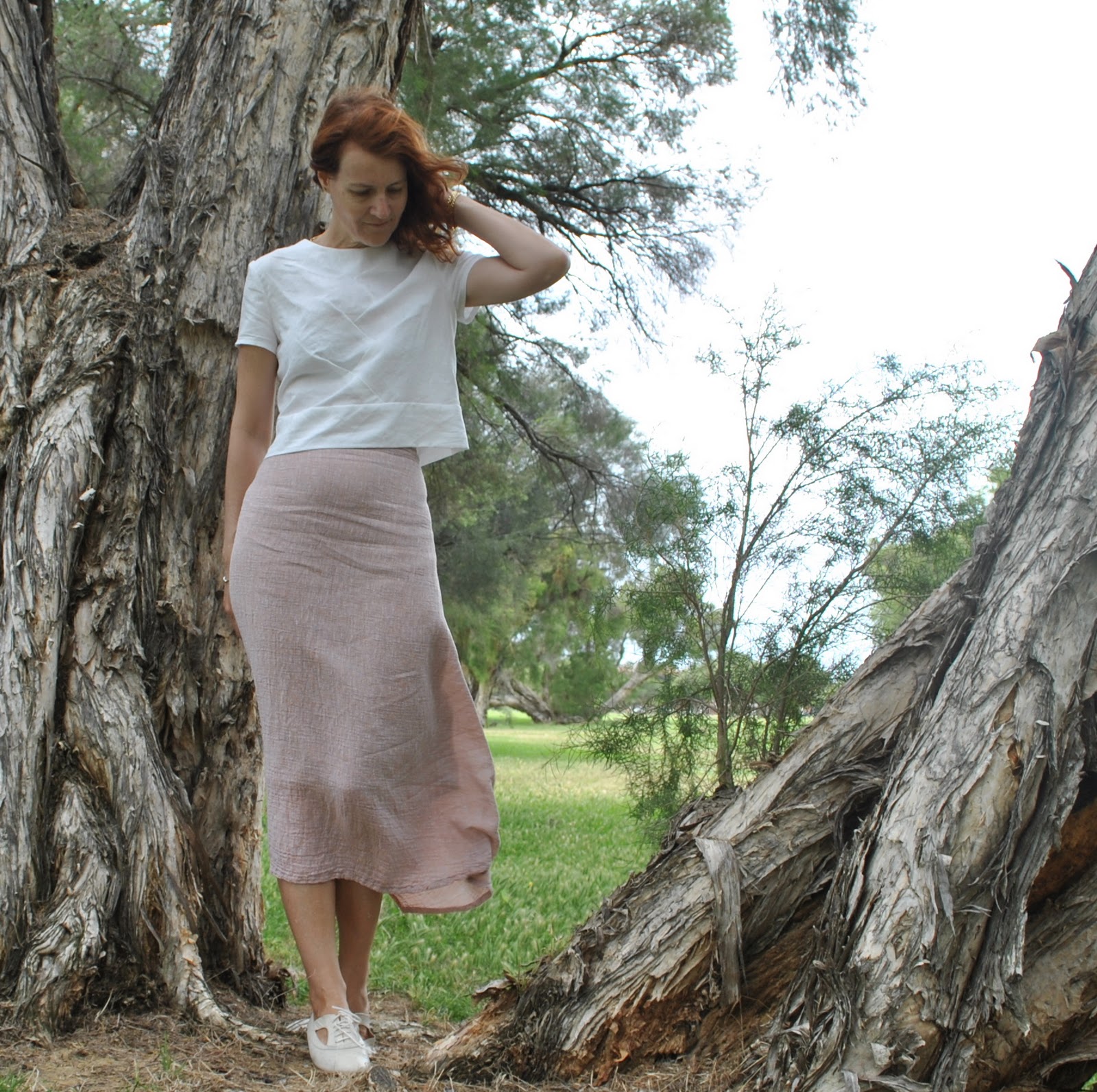 I like this style of blouse, it brings back strong memories to me of the blouses we used to wear in our winter school uniform, over our plaid wool skirts. Except our school blouses had a collar and were buttoned up at the front, naturally. This top is quite loose, so I can leave all the buttons done up except the top one and slip it over my head. This means only the top button needs doing up behind my neck, which is good, since I discovered that doing up that middle button requires a solid command of yoga… And about that; I’m thinking it is about time some new moves were introduced into the Yoga repertoire along with saluting the sun, and the down dog and all that; may I suggest “lady doing up her back buttons/zip”? I think that would be a pretty useful new move, yes?