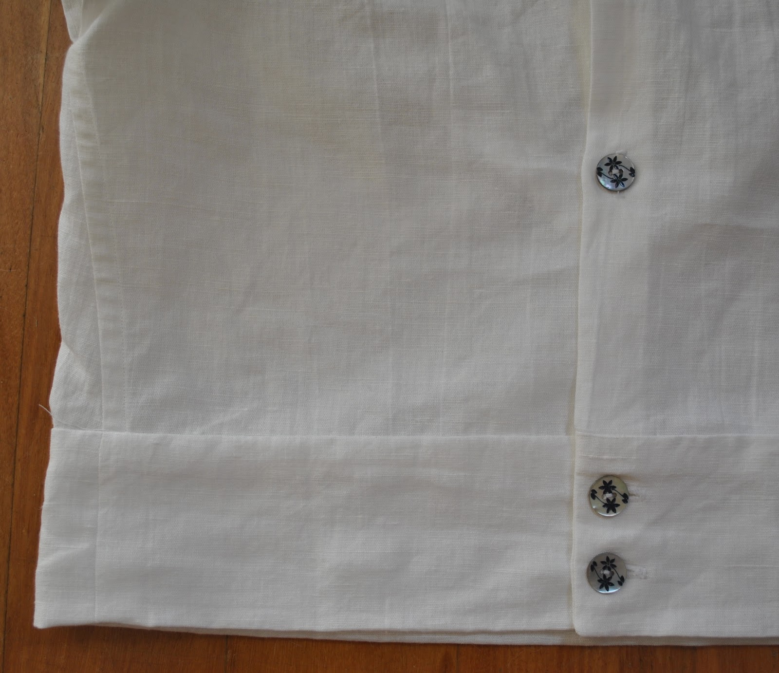 The neckline is faced, the side and shoulder seams are flat-felled, and the armhole seam allowances are finished with HongKong seaming. The buttons are the little shell buttons that I bought in Tokyo, whilst out shopping with Yoshimi, Novita and my daughter Cassie, so I felt it was quite right that I use Japanese buttons for a Japanese designed garment. Fitting, yes? The buttonholes on the button band are vertically aligned, whilst the buttonholes on the waist band are horizontally aligned, this is a little feature that I recalled from my old school blouses, and wanted to have it in this blouse too.