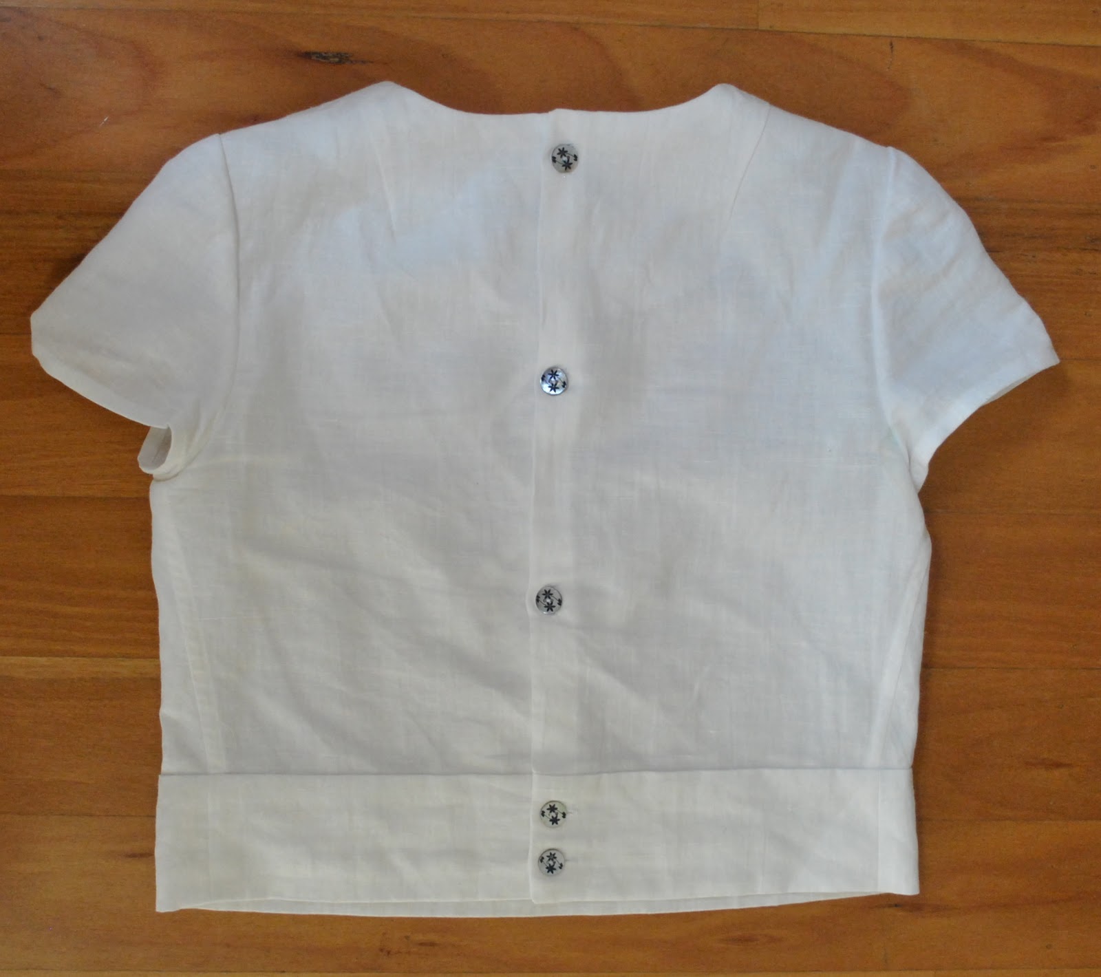 I chose to make this design into a little top with short cap sleeves, a buttoned up back, and a wide loose waist band; necessarily a shortish top because of the constraints of my fabric. Yup, I was using up scraps, as per usual! From this linen shirt I made for Craig… (I know it may seem like most of my clothes are made from scraps, and I have to admit a fair whack of them are! The thing is, I loathe waste with a passion… and have been known to hoard scraps for years…. hehe. Some day I will have to round up in one post the projects I have made, purely from scraps)