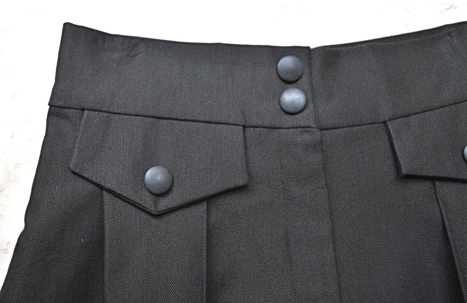 I particularly like the “trouser” styling of the skirt. It’s a really tailored kind of looking skirt, and yet still manages to look cute and funky. The front pleats are sharp; in the cool and stylin’ sense of the word… I also love the interest of the little flaps over the front pleats. The turn-up at the hem is yet another interesting feature in a little skirt packed with interesting features.