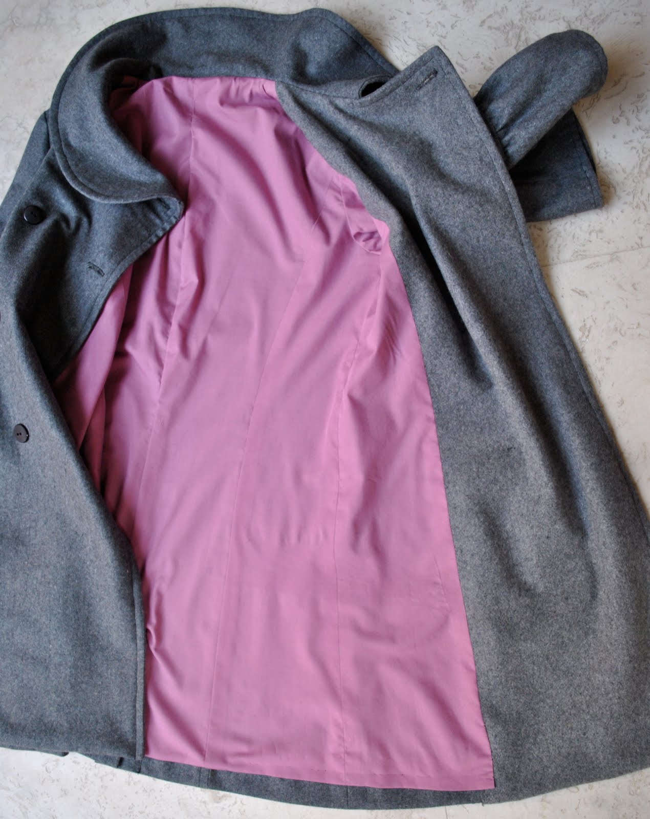 Woven grey wool for the outer, purple/pink cotton poplin for the lining.  Thicker felted wool fabric for the under collar and facings (because I didn’t have enough of the outer fabric)