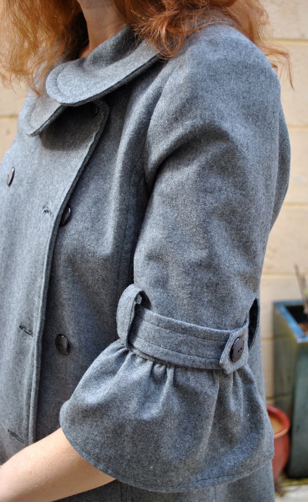 This is such a stylish and versatile coat pattern.  The pattern is well designed; it went together very easily, all the pieces fitting together as they should with no difficulty.  The one piece sleeves make this a breeze to sew.  I made view B, and I particularly love the flattering asymmetrical collar, very “designer” and slightly retro.  I think this view would work beautifully in heavy satin for an evening coat.  I also particularly like the button bands on the sleeves of this view.  I hand-tacked these bands to the sleeve seams to lessen the risk of them “rotating” around the sleeve during wear.