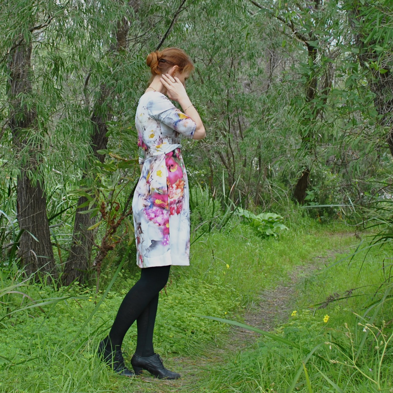 The skirt is actually three separate identical chiffon skirts, layered. One is attached to the shell of the dress, the other two sandwich the lower edge of the lining. Each side seam is sewn in French seams, and I finished the lower edges of each skirt using the rolled hem stitch on my overlocker. I do really love the romantic ripply look of the layered skirts. The design is a very lovely shape. Very twirl-tastic, yes? I did a twirl photo, just because. Hehe, one of my pictures revealed that I am a fairly grim-faced twirler. I am so impressed by people that can twirl and have a happy, carefree facial expression at the same time. Me, I need to concentrate on not falling over!
