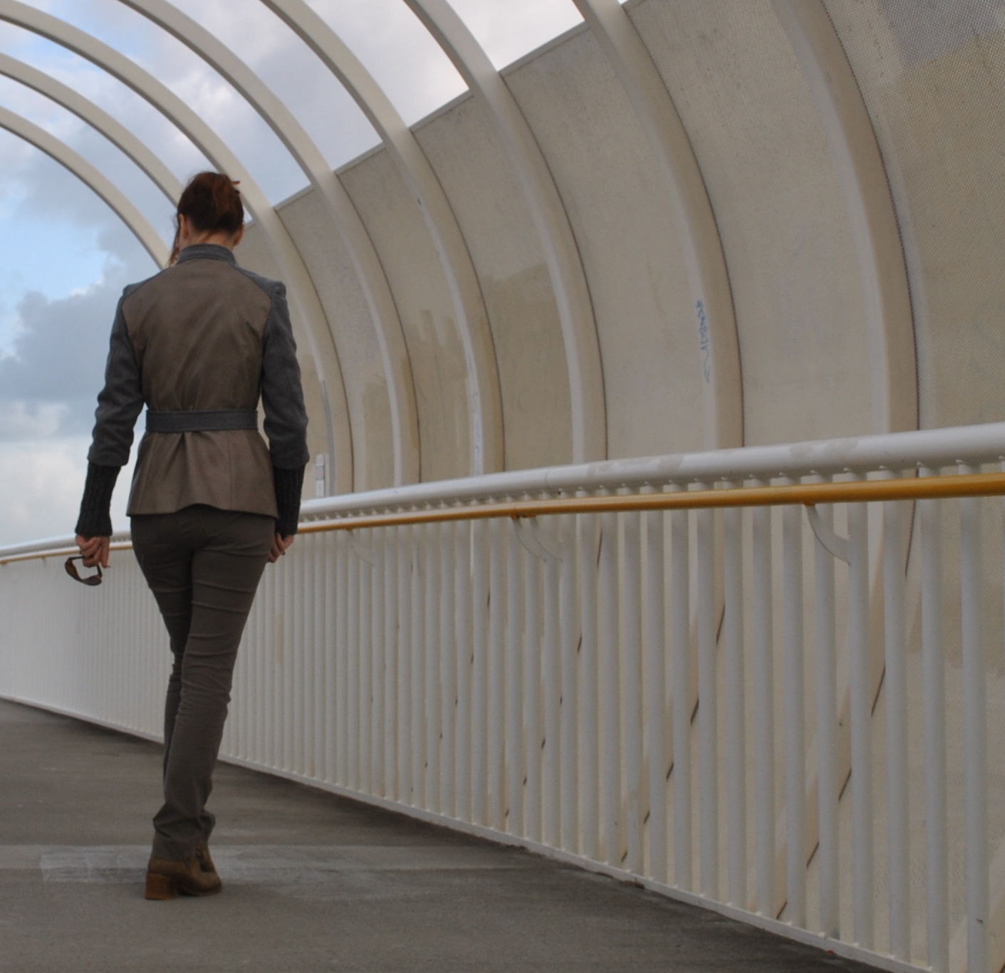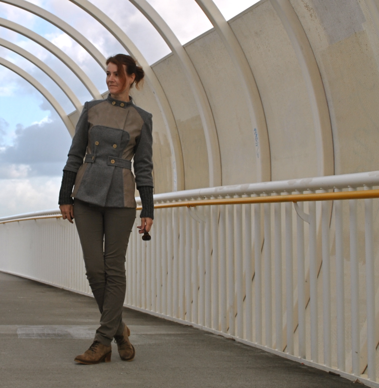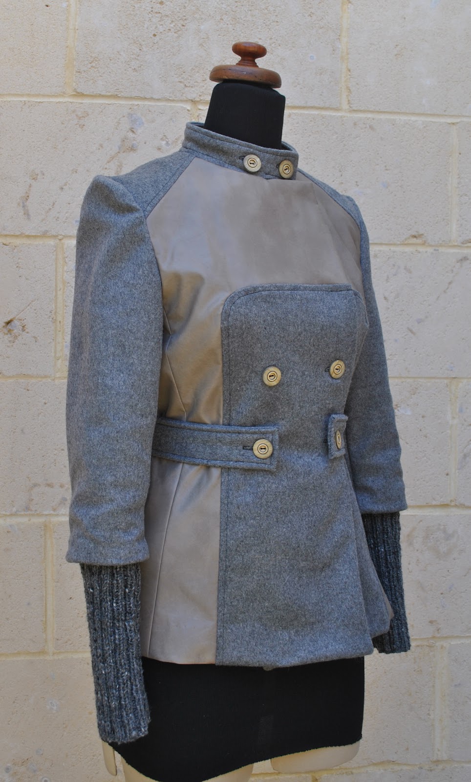 I used a browny-grey polyurethane laminate, originally from Fabulous Fabrics and leftover from this skirt, and a grey wool, originally from Spotlight and leftover from this coat.  Whoar, it felt gooood to use up that fabric!!  The knitted wristwarmers are knitted from Jo Sharp Silkroad DK Tweed in colour Peppercorn, the leftover yarn from this cardigan.  I didn’t have quite enough of the wool to knit the full length required, but I think they turned out quite long enough anyway.