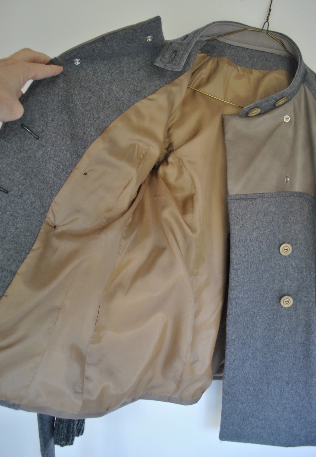 The collar is faced with a lightweight elephant-grey cotton rather than with self-fabric; this is because that wool is thick!  It was pretty hard to get all those double thickness shoulder and collar seams all sitting down on the inside nice and flat as it was, without the extra bulk of a woollen facing… for that reason I did not button the collar ends back on themselves as suggested in the pattern because the grey cotton facing fabric would have showed.  Instead my collar just crosses and buttons right end over the left.