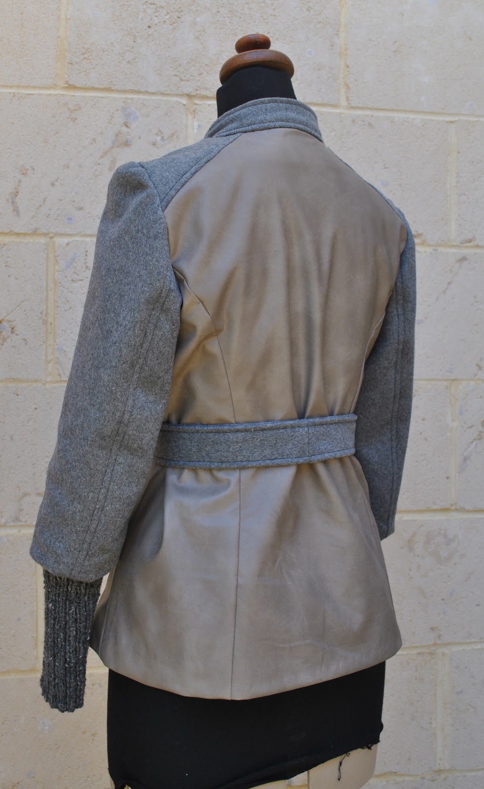 I cut the back, sides and fronts of the jacket from the PU laminate: and the centre fronts, shoulders, collar, sleeves and the belt from the wool fabric.  Even though I did not have enough of either fabric to cut the whole jacket, I did have enough of both together to make the jacket 15cm longer than stipulated in the pattern, which suited me to a T.  I prefer a hip-length to a cropped jacket, particularly when in a very fitted style like this.  I left off the gathered peplum, and instead cut the back piece as one long piece.
