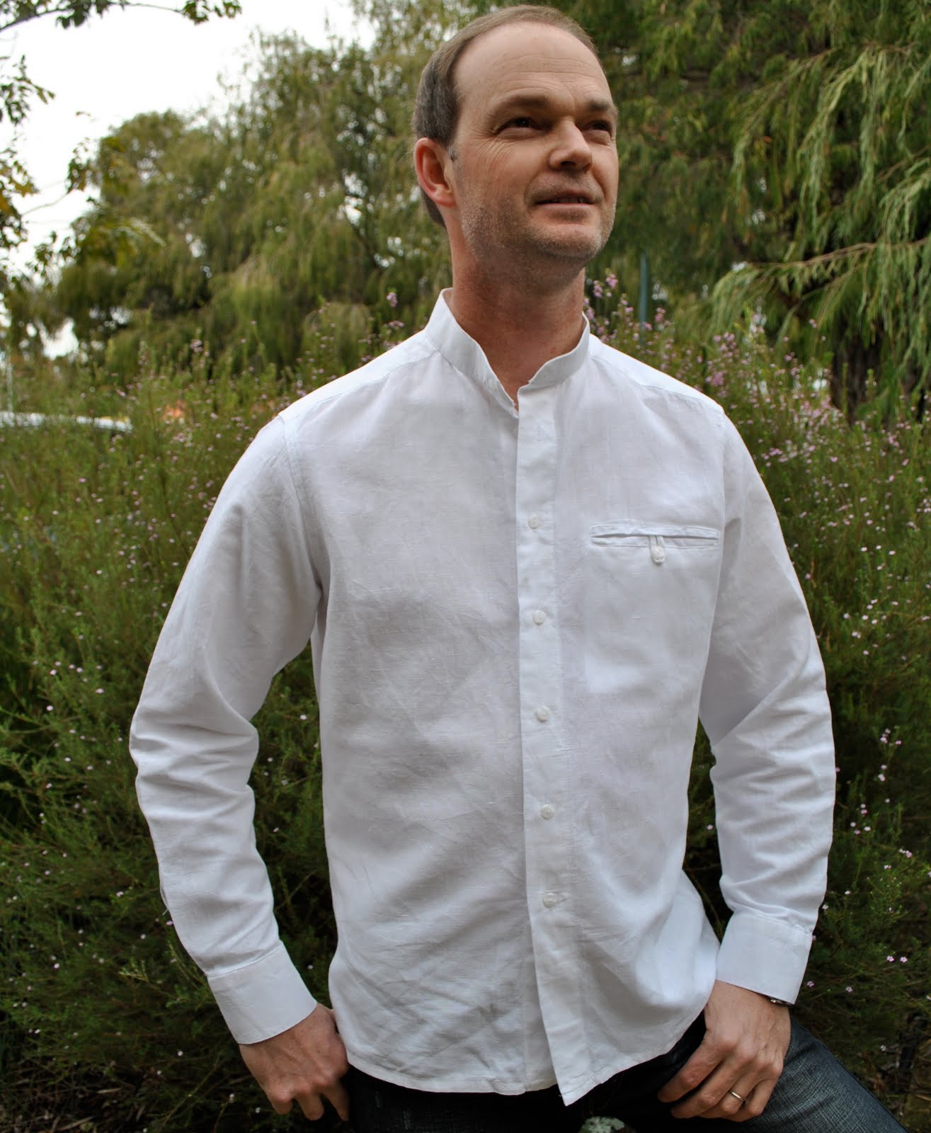 Version six; for Craig, white linen, white topstitching and buttons. Variations; one double welt breast pocket with looped button closure, no collar, curved lower hemline. Yup, I’ve borrowed this one a tonne too…!