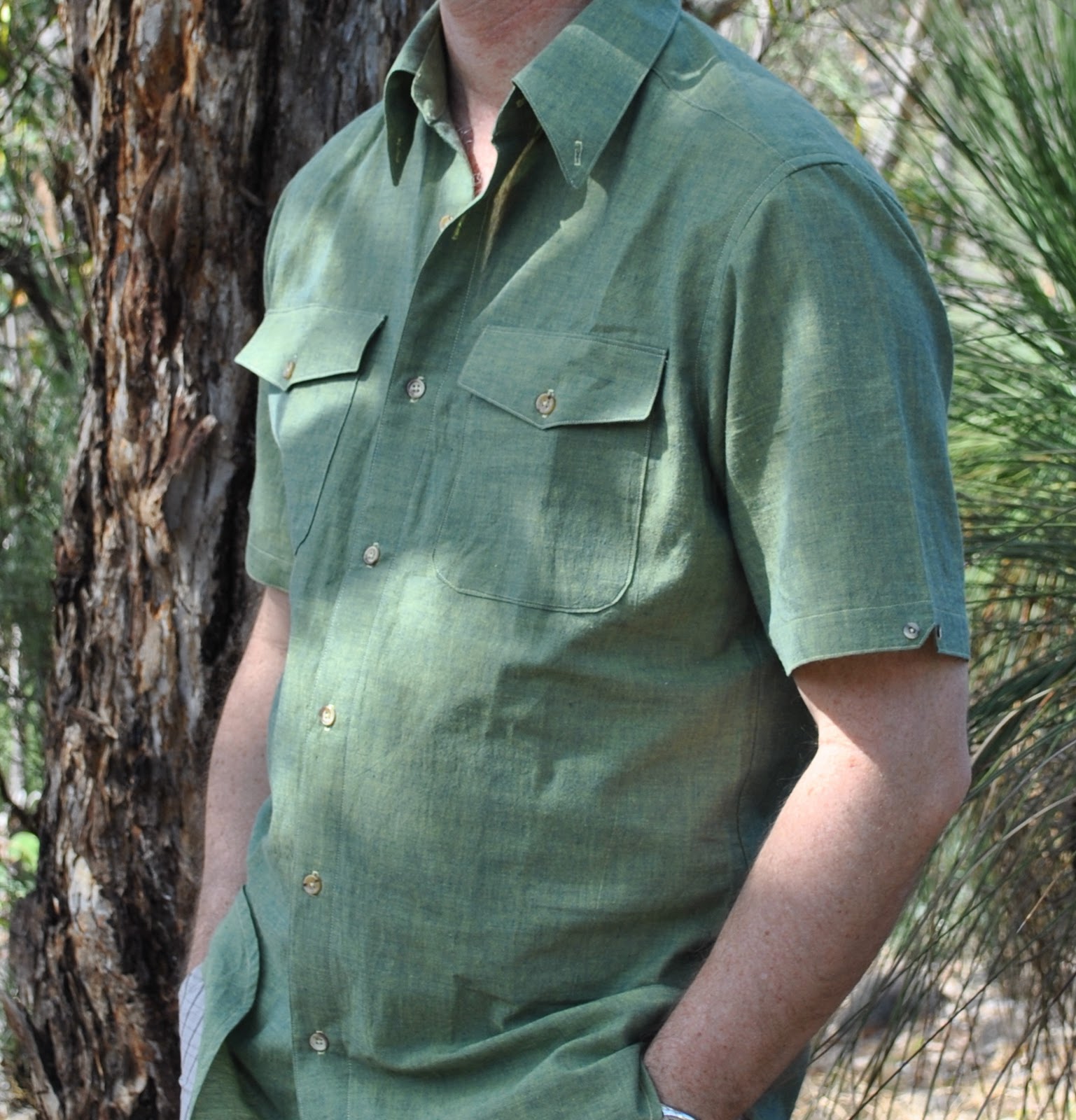 Version nine; for Craig, green shot cotton, contrasting yellow topstitching, brown mottley buttons. Variations, of summer weight cotton, with short sleeves, double curved edge breast pockets, arrowhead pocket flaps, curved lower hemline. Did an interesting little triangular cut-out feature thingy on the ends of the sleeves