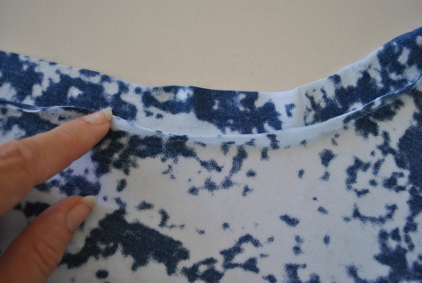AND, since your stitching line is a longer length than the raw edge, (being a concentric circle of a wider diameter) your band is a slightly shorter length than the stitching length around your neckline/armhole, meaning the band will be stretched slightly during stitching and WILL sit up nicely on the outside of the garment when finished.
