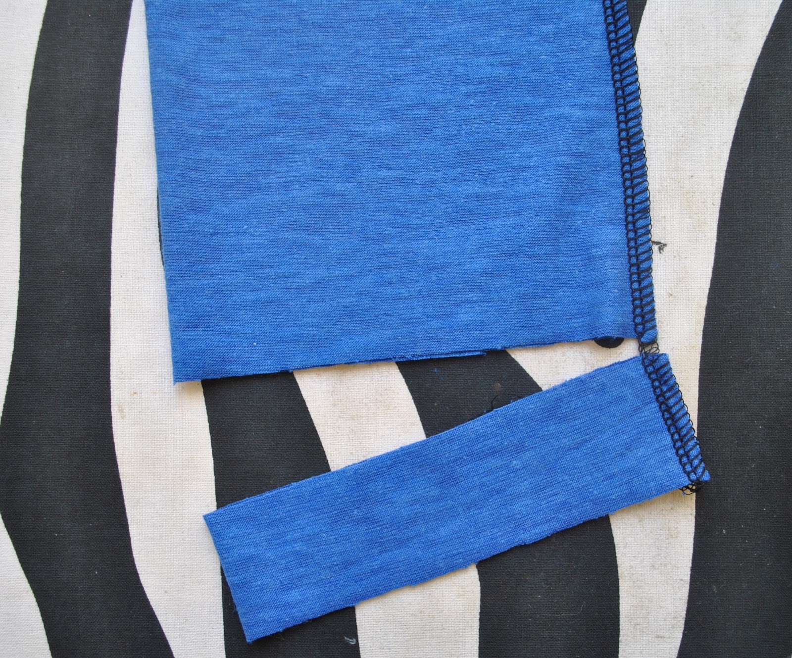 The width of your strip should be double the desired finished strip width plus seam allowances… So for example; say I wish for my neckline band to be a finished width of around 1.5cm, and I am allowing a seam allowance of 1cm. I should cut my bands to a width of (1.5cm + 1cm) x2 = 5cm; and then add a tad to allow for losing some in the fold-over process, so round it up to 5.2cm.