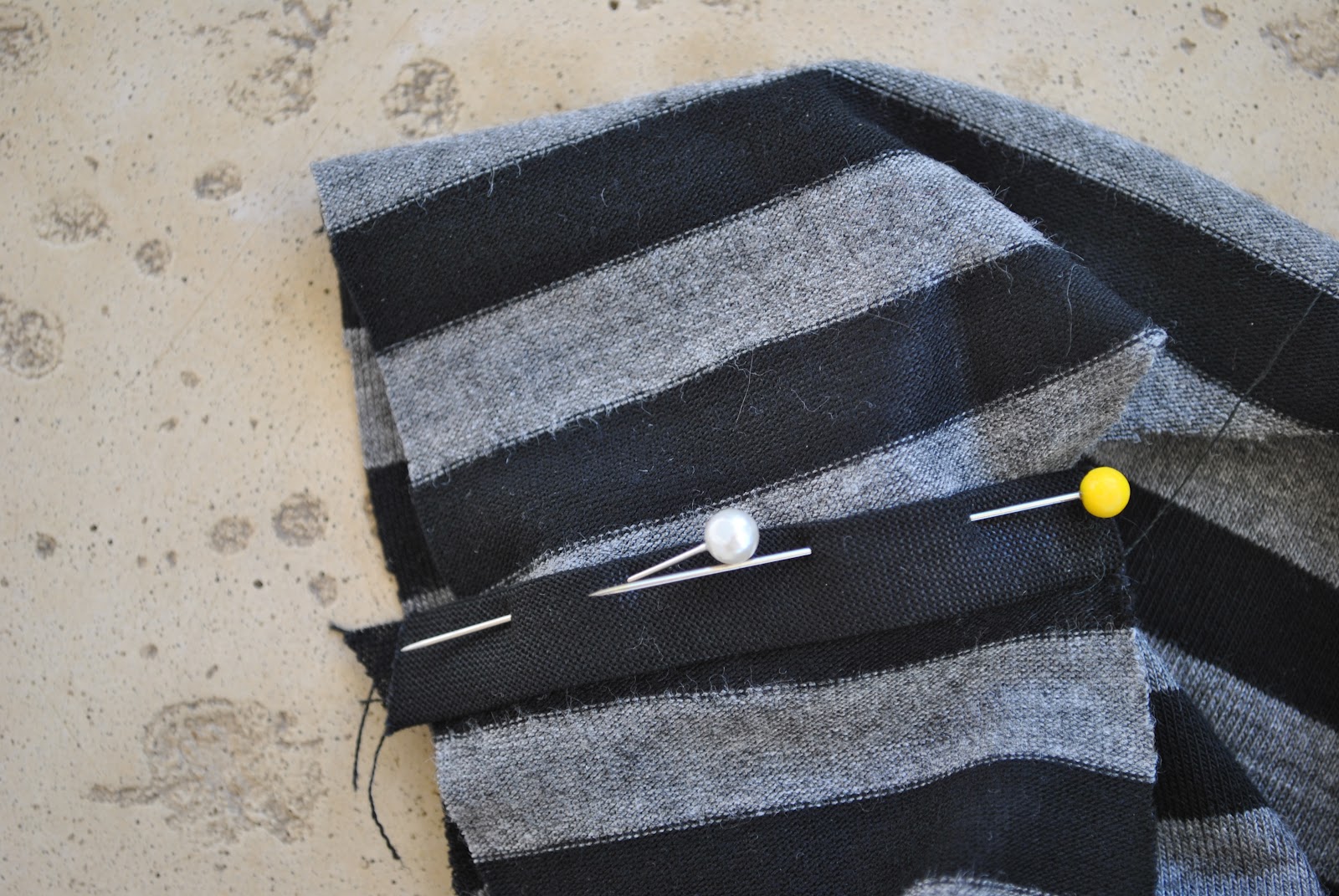 Now, since my fabric in this example here is a stripe, I wanted to get the stripes matching with the joining seam invisibly between two stripes. This meant cutting the band to a different, very slightly shorter length that was ideal compared to my measurements. In the case of pattern matching like this, it is OK to cut the strip a tiny tad shorter, but NOT longer, than required, but you do not want for the difference in length to be any more than 5%. If you are trying to match up wide stripes and your measurement looks like it is going to be more than 5%, then it would be best to not bother with pattern matching. Any differences bigger than 5% will mean that your garment will look bunched up, or “gathered”, into the finishing band.