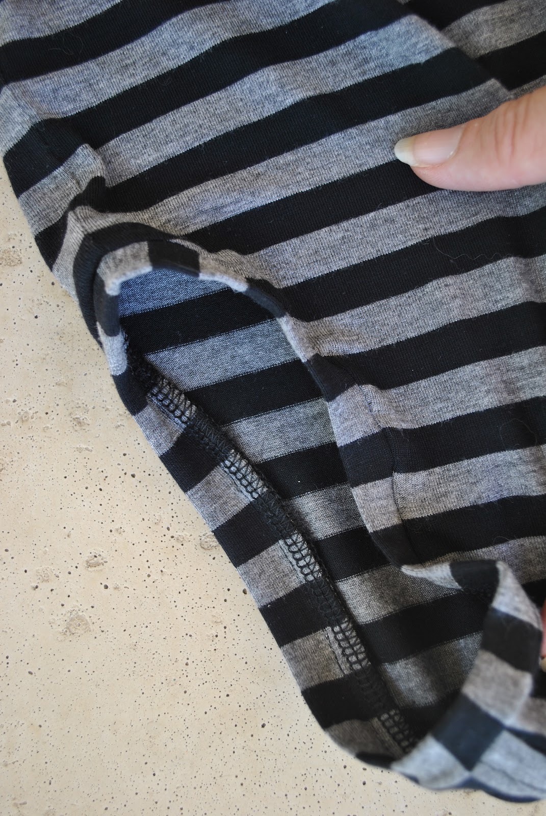 In making my grey striped jersey dress here, I opted to re-inforce the shoulder seams. I do not re-inforce the shoulder seams in all my knit garments, but in this case; a long tank dress in a stretchy fabric, where the weight of an entire dress is hanging off those two meagre teensy little shoulder seams, then it is a very good idea to build in a little extra strength in this vulnerable area.