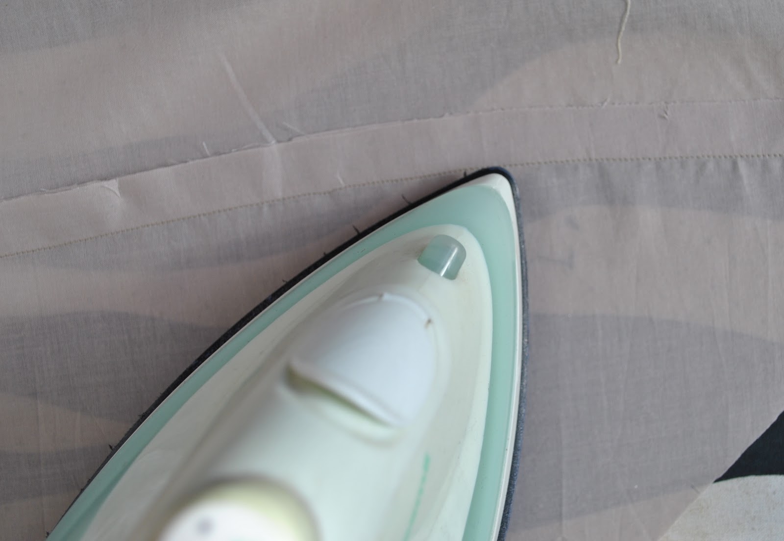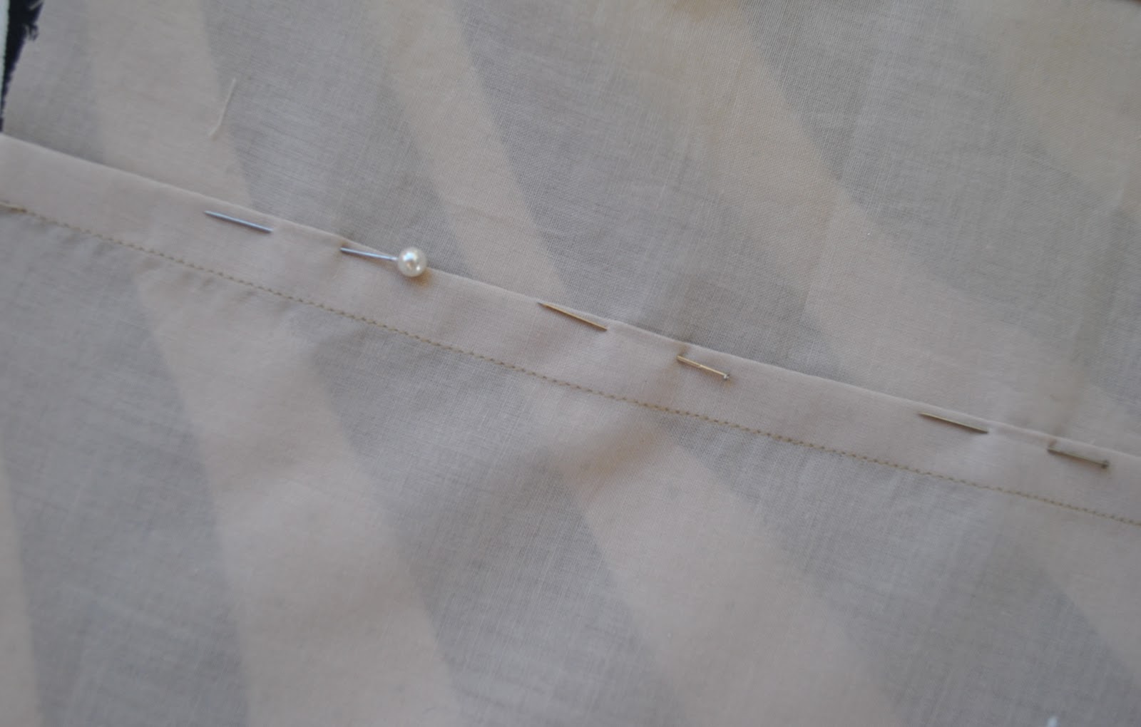 The bias strip is pressed up, and a narrow 6mm seam allowance pressed down on the upper edge. This pressed edge is simply slipstitched down invisibly in place.