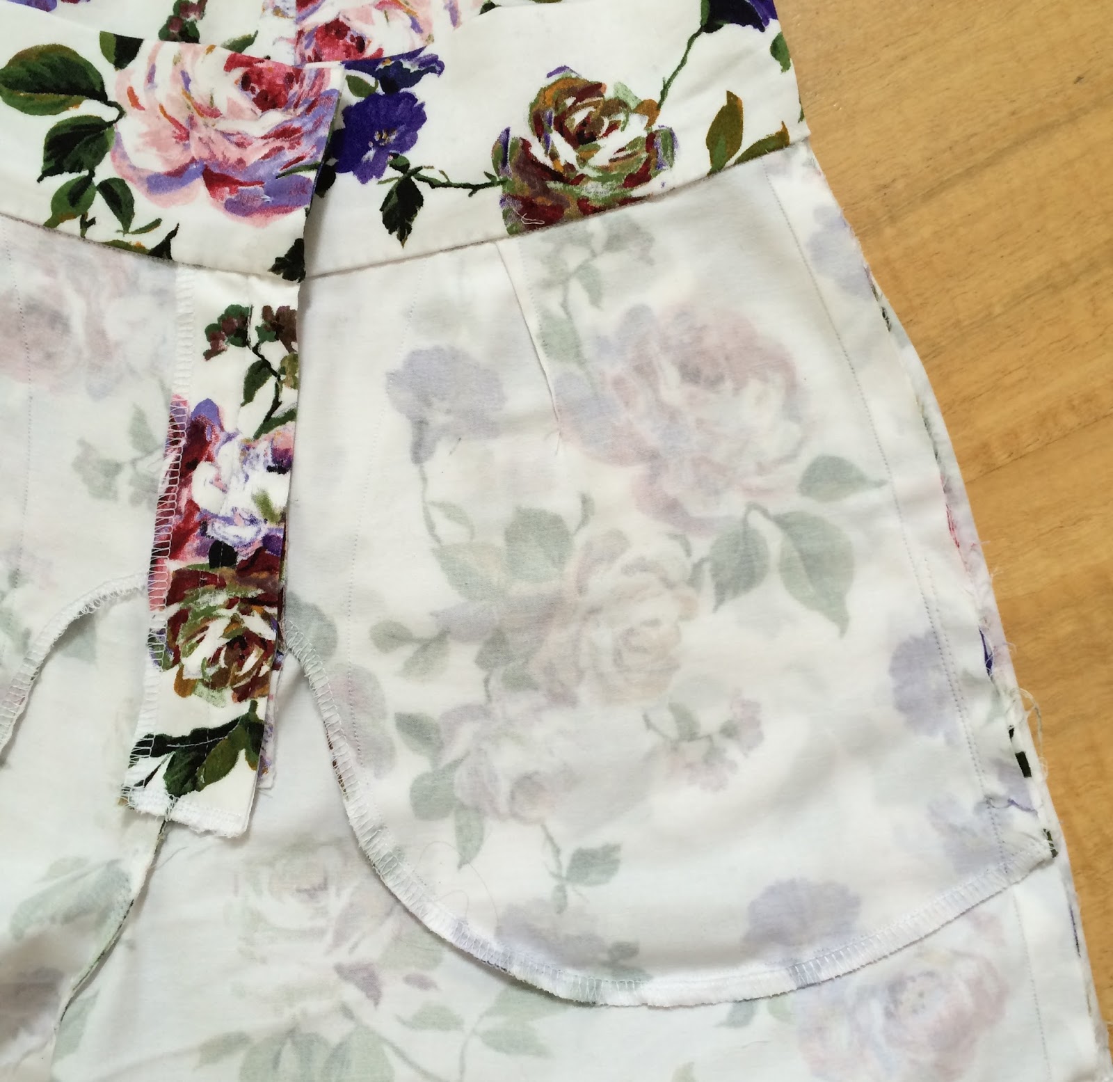 To finish; the side seams were pinned, and the already-understitched front facing was wrapped around over the top and over the back waistband piece.