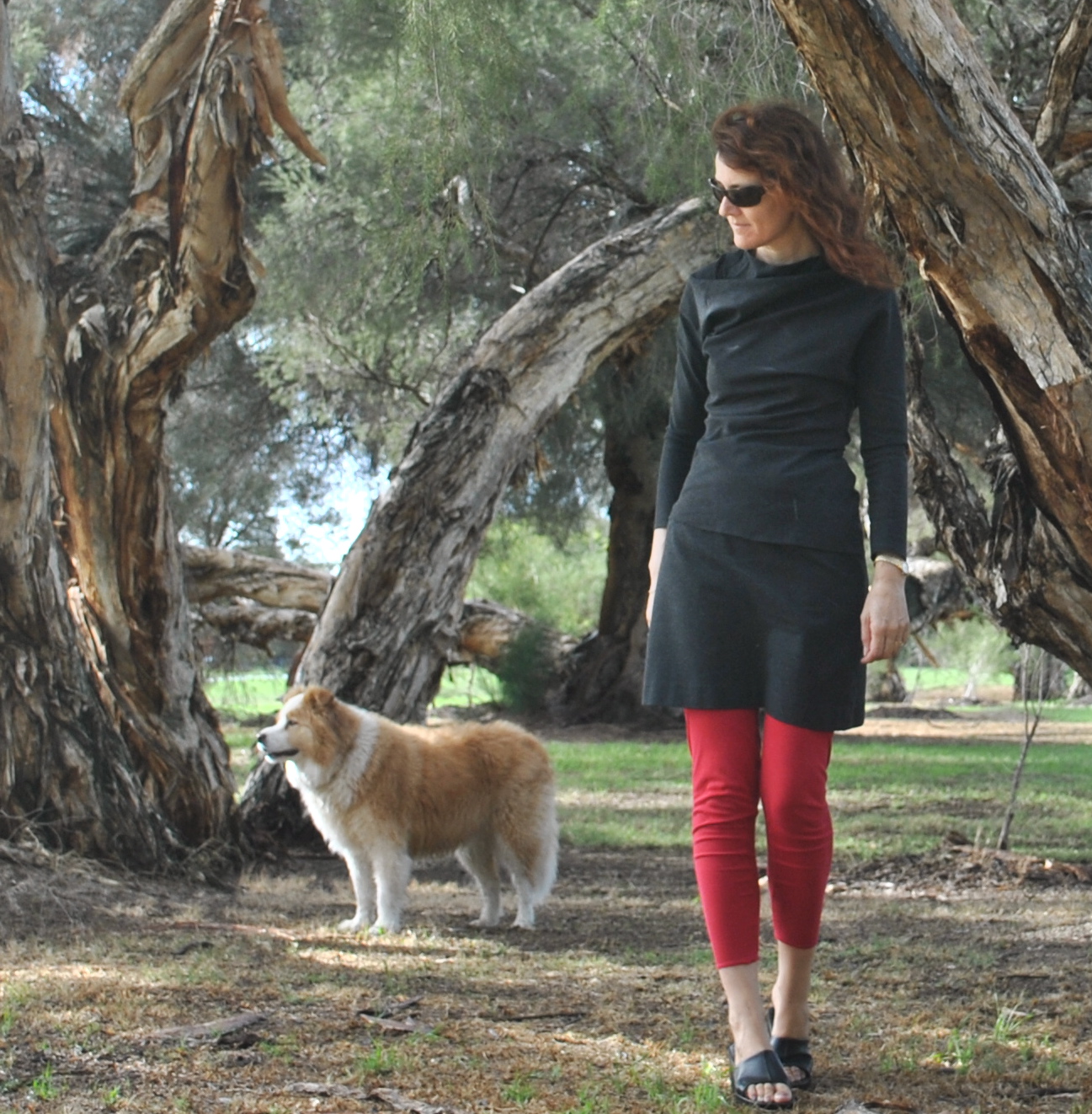 Leggings; self-drafted, red jersey knit, details here, and using my own tutorial for drafting your own custom-fit tights/leggings here