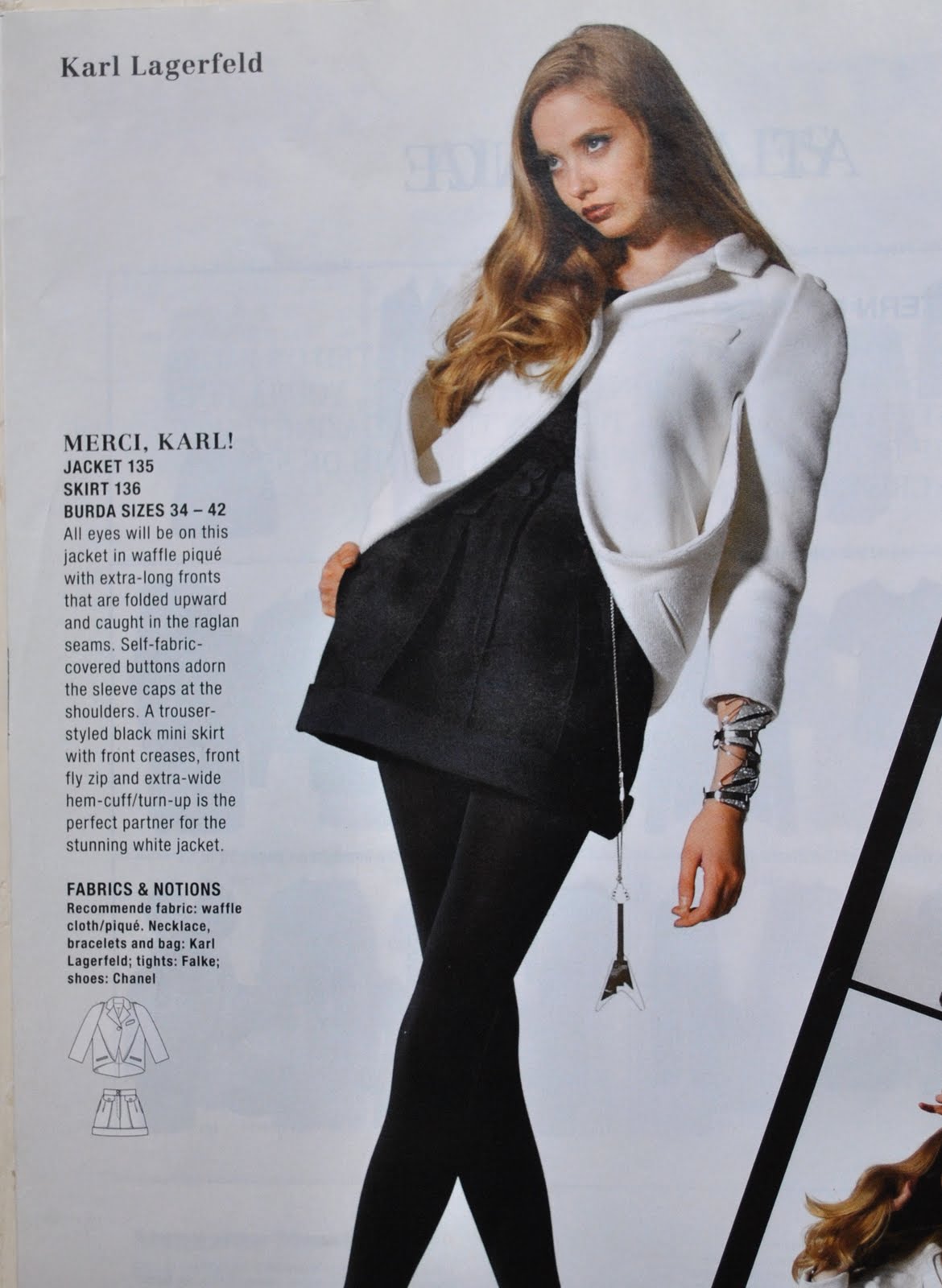 It is a lush jacket, is it not? The fabric is veeery over-the-top and extravagant, a more luxurious look than I am used to wearing much. The year I first made it I was wearing it with jeans to tone down the whole opulence of it, but for today to show it off for the first time here I wanted to dress it up just a leettle bit more. But still with the plainest of garments; a white shirt and my black Karl Lagerfeld skirt. Since he is the creative designer of Chanel it seemed fitting, n’est ce pas?