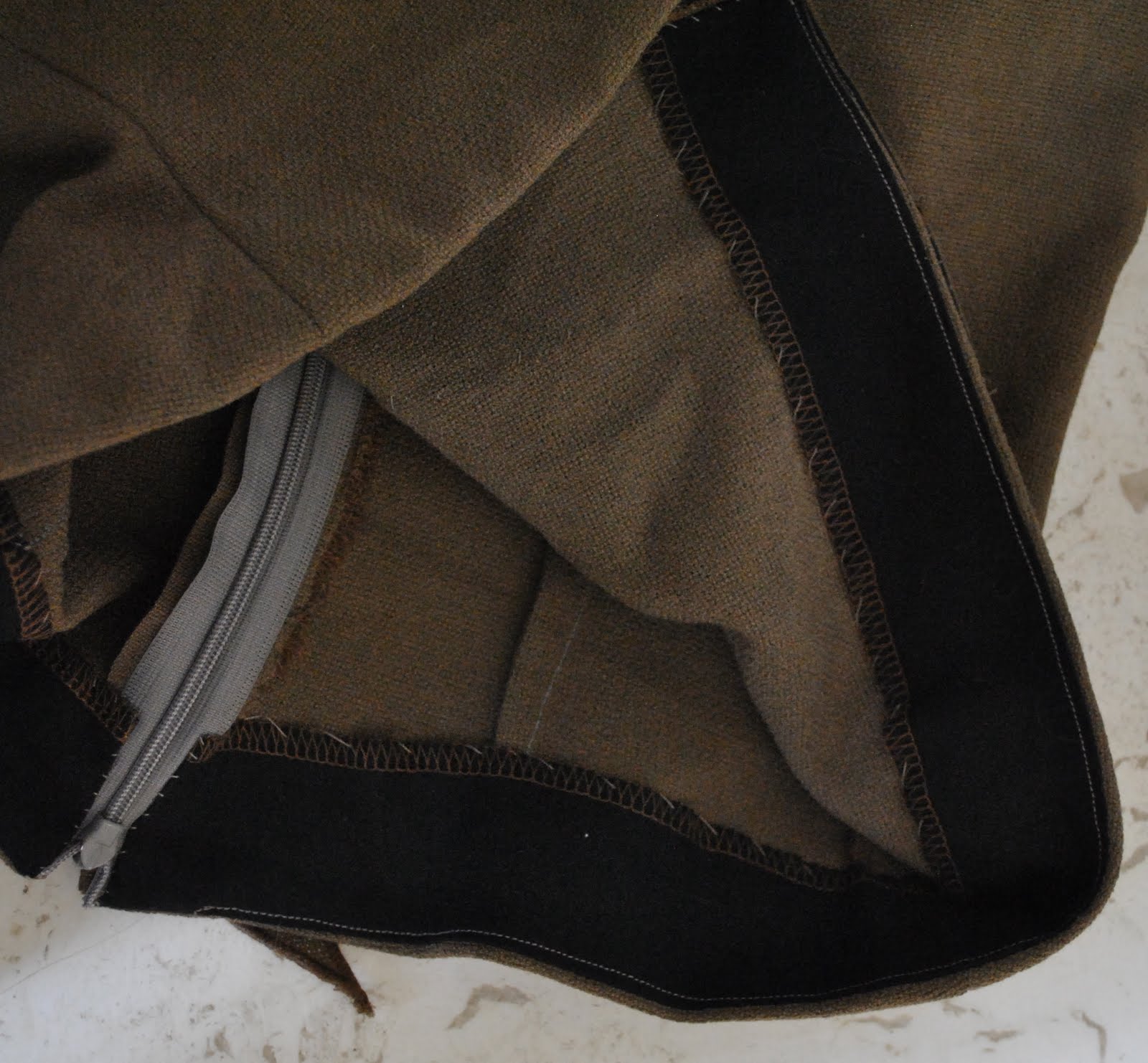 I used the fabric that was an unloved remnant from my friend C, that used to be pale pistachio green and which I dyed using iDye for Synthetics in Brown, here. My fabric was limited, so I used strips of bias-cut black cotton for an interfaced lower edge facing. It is understitched and invisibly slip-stitched to the garment.
