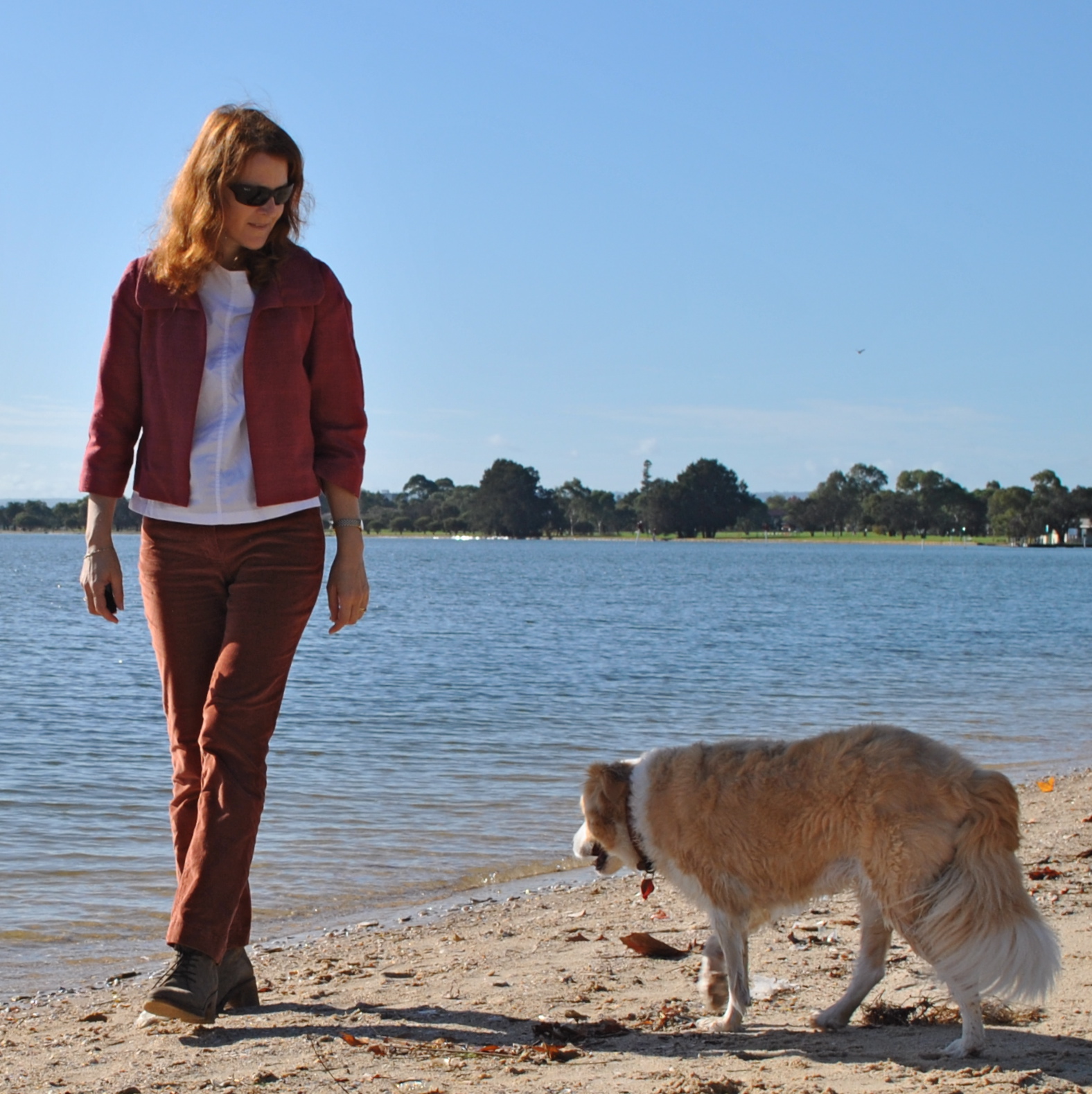 For a start, I would recommend drafting a wide front edge facing which folds around the front edge including the neckline opening and enclosing the collar seam allowances, and attaching at the shoulder seam. I think this would make for a cleaner finishing look. See in the collar close-up below how you can see the inside edge of that narrow right front edge band? I don’t really like seeing that, and wish it was wider, and therefore invisible from view. I would have done this if I had more fabric to play with… but with the scarf in place it isn’t really too obvious when you are wearing it.